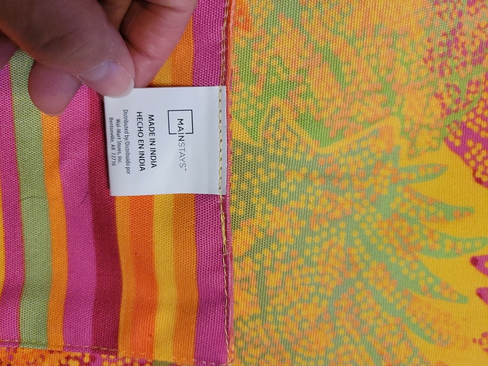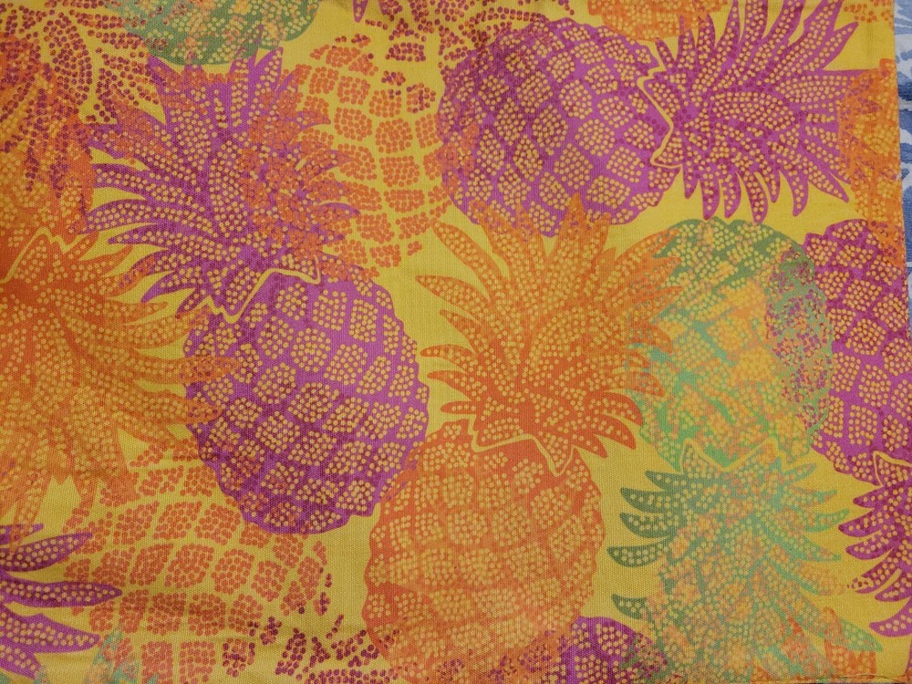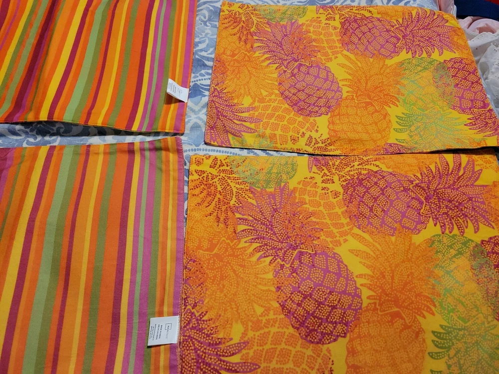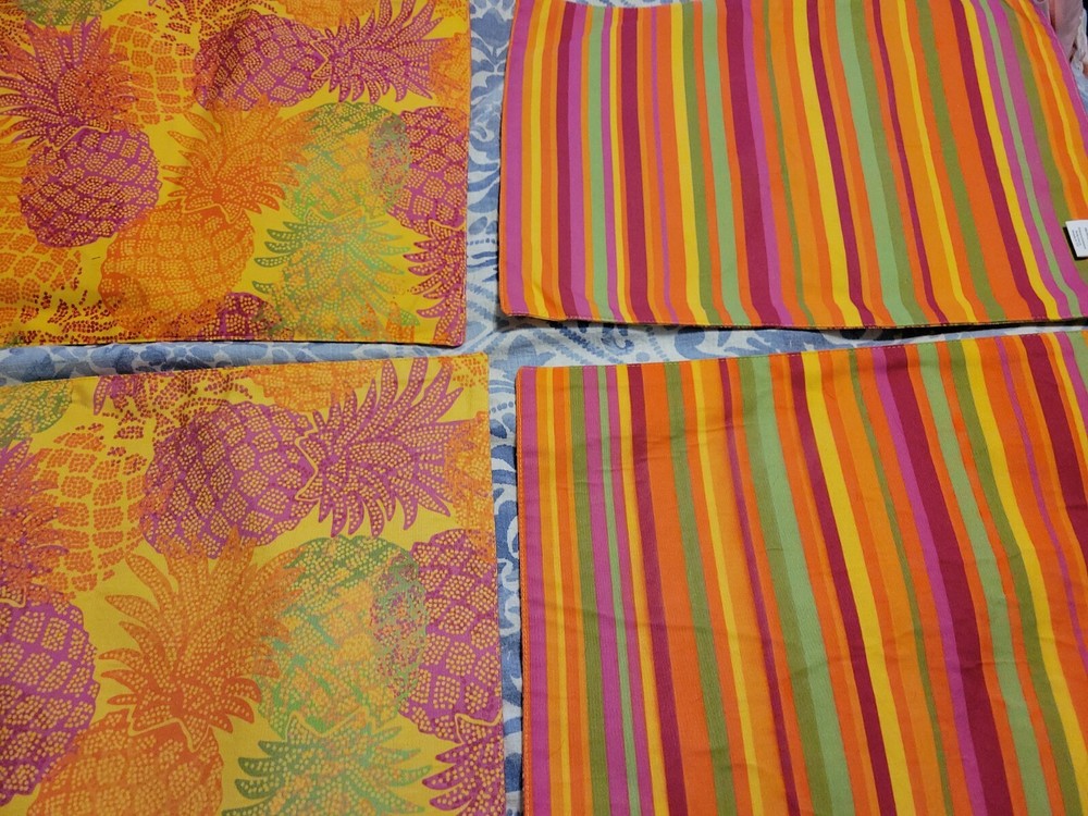 4 nice bright colored red orange cotton fabric place mats by mainstay pineapple and stripes pre owned clean condition.