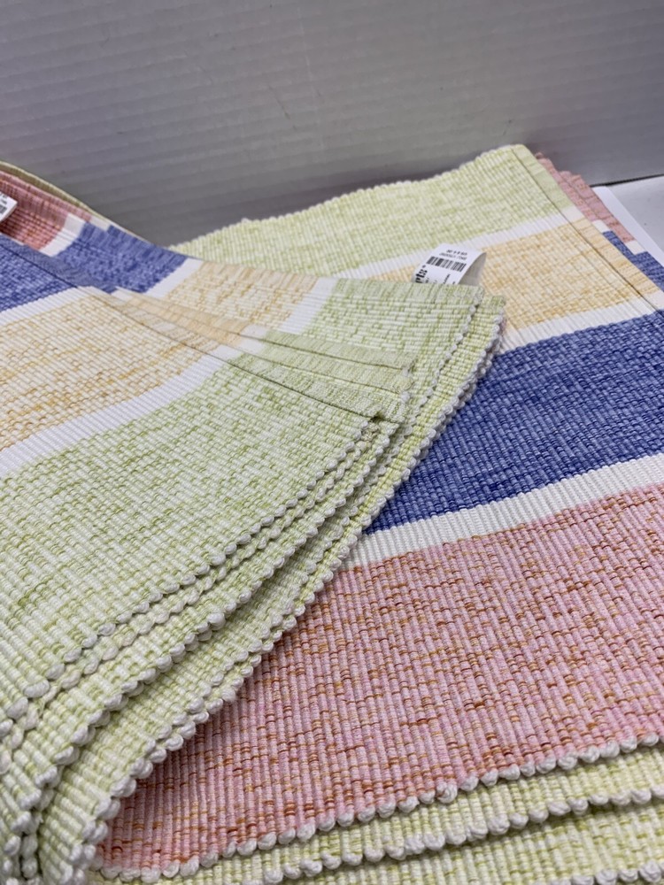 Add a pop of color to your dining table with this set of 11 Pier 1 Imports placemats. Made of 100% cotton in a vibrant multi-color striped pattern, these rectangular placemats are perfect for any occasion. Excellent condition.