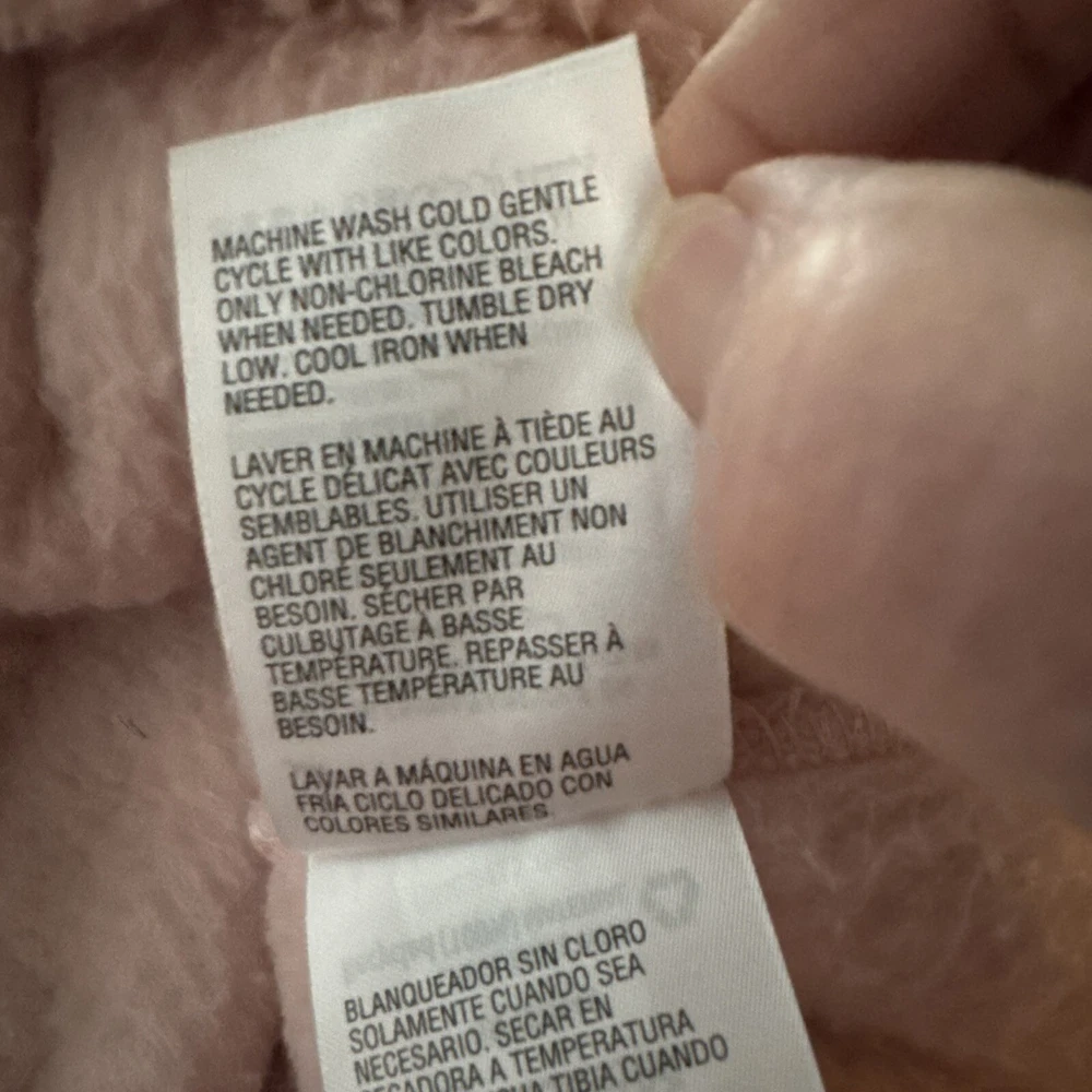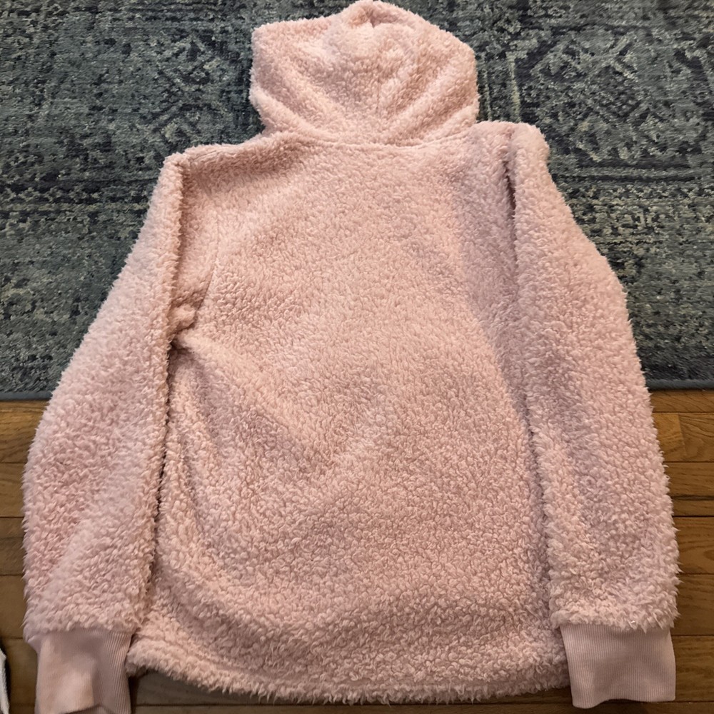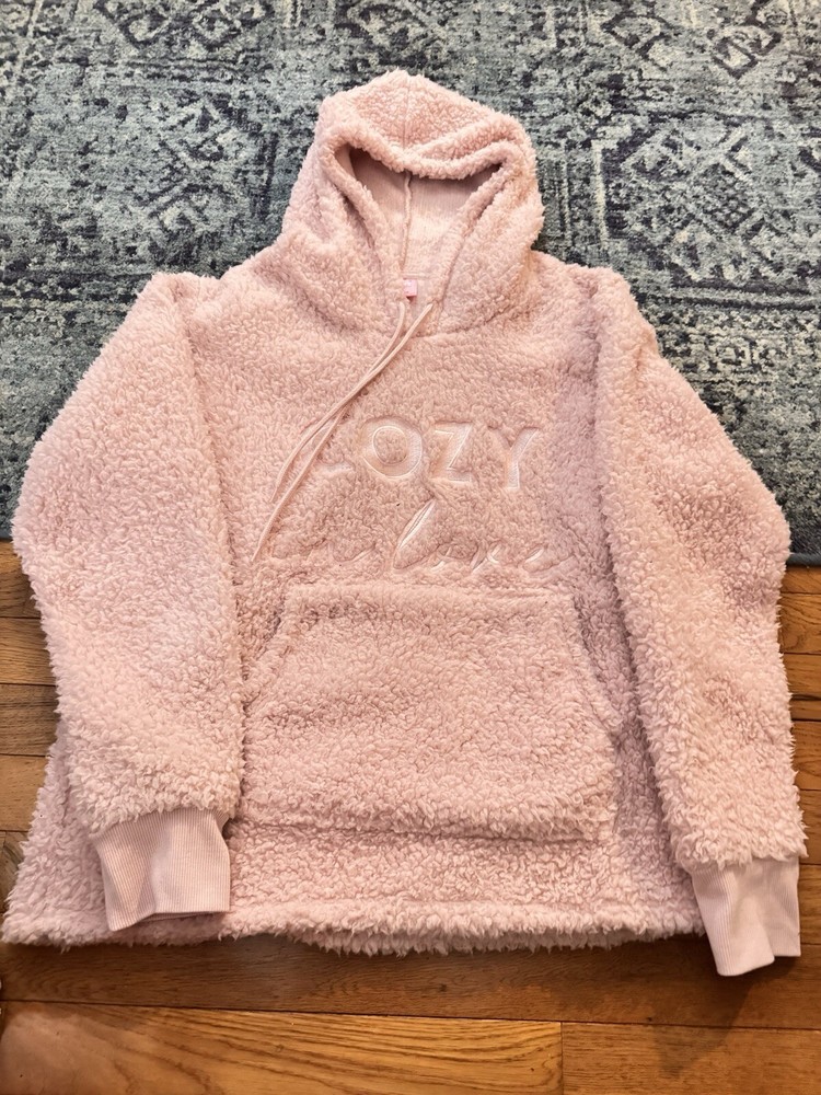 This plush Sherpa hoodie by Jenni is the perfect addition to your wardrobe. The hoodie comes in a light Barbie pink color and is available in women's size large. It features a solid pattern and long sleeves with ribbed cuffs. The hoodie has a drawstring closure and a kangaroo pocket. It is made of polyester and fleece fabric which makes it cozy and thermal. The hoodie is perfect for travel and casual occasions, and it can be worn in all seasons, including winter, summer, fall, and spring. It has an oversized fit and is machine wash cold. The hoodie is accented with “Cozy In Love”, and its neckline is a hoodie. Pet free & Smoke free home Excellent Condition!