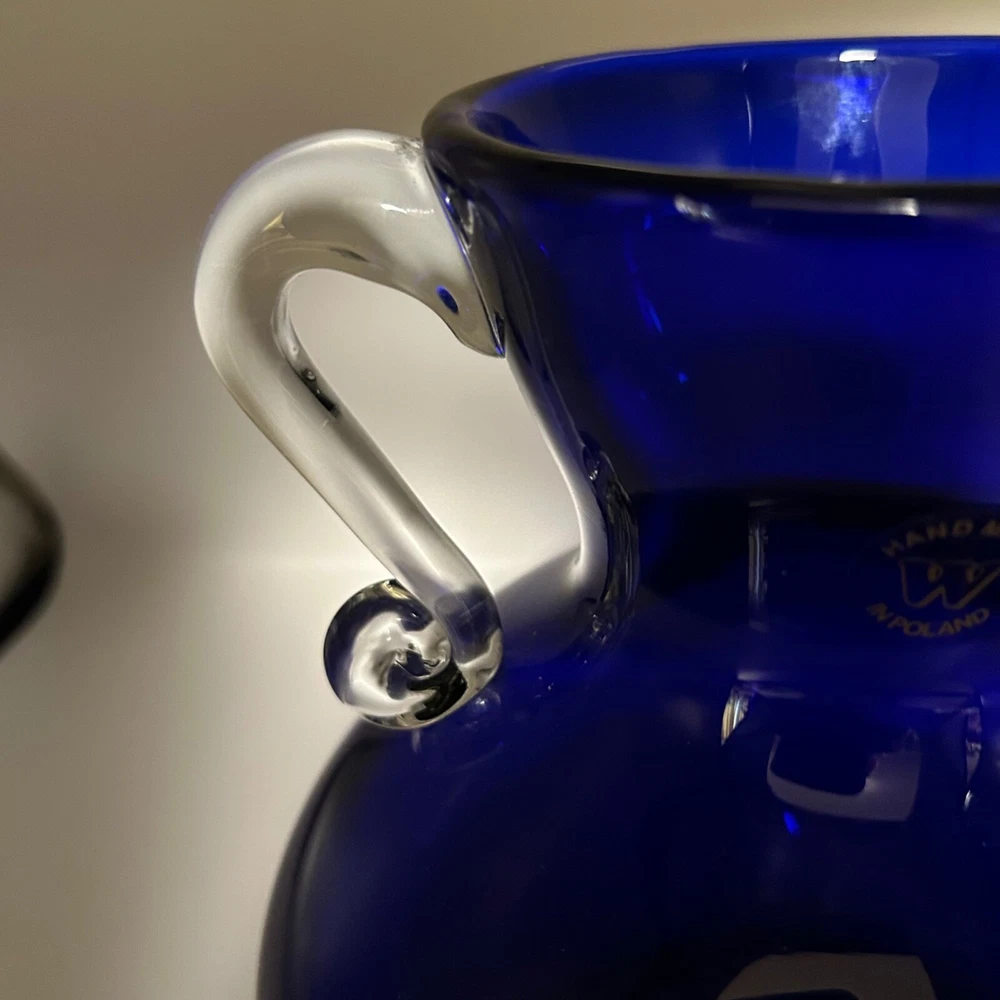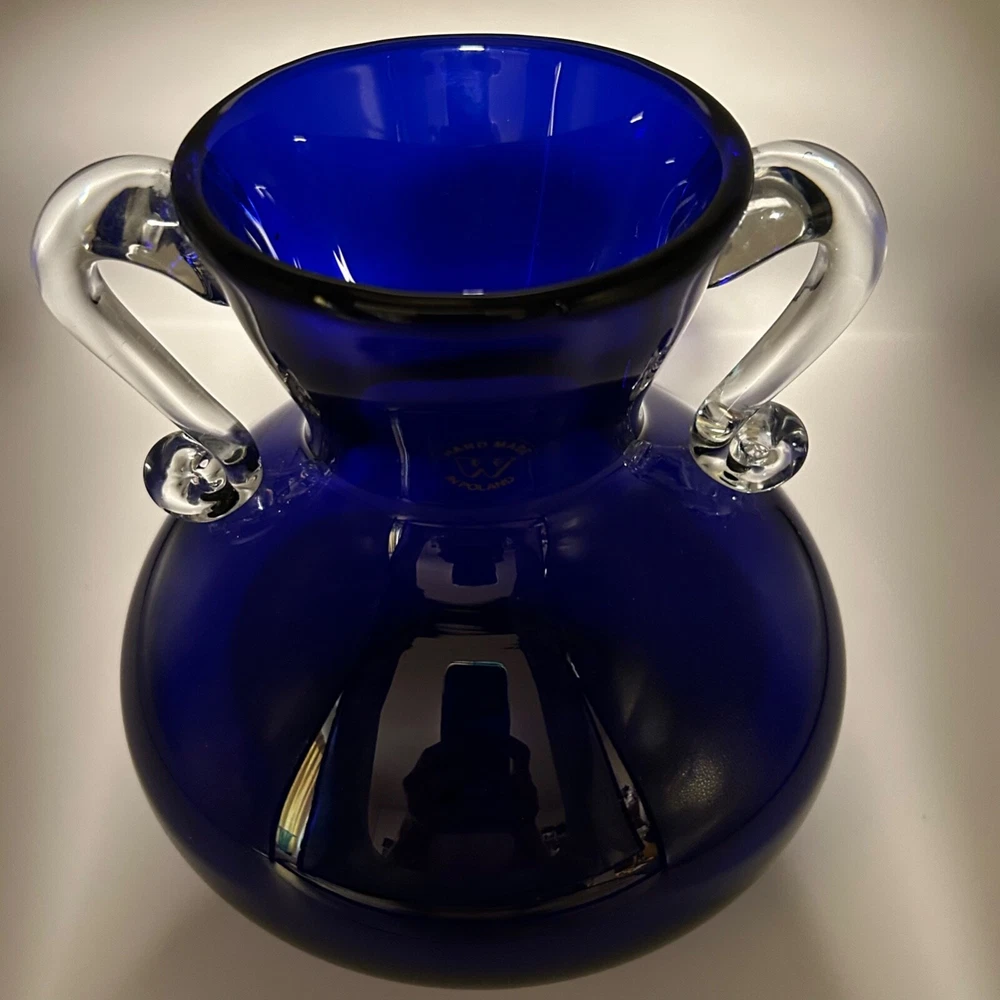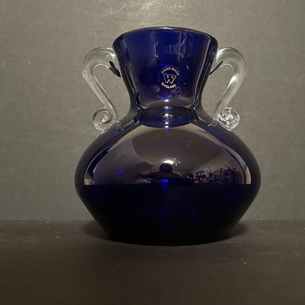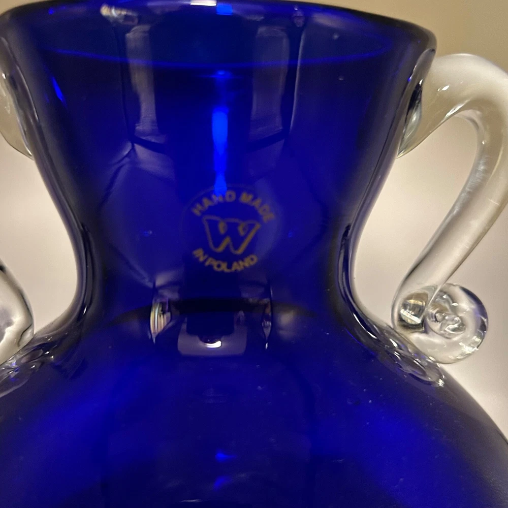Poland Wanda Imports Hand Blown Cobalt Blue Clear Double Handled Vase Stunning! This is a absolutely elegant, beautiful piece that will surely make a statement in any setting ! The cobalt blue is rich and yummy!