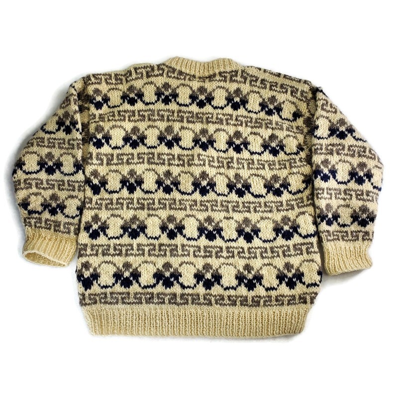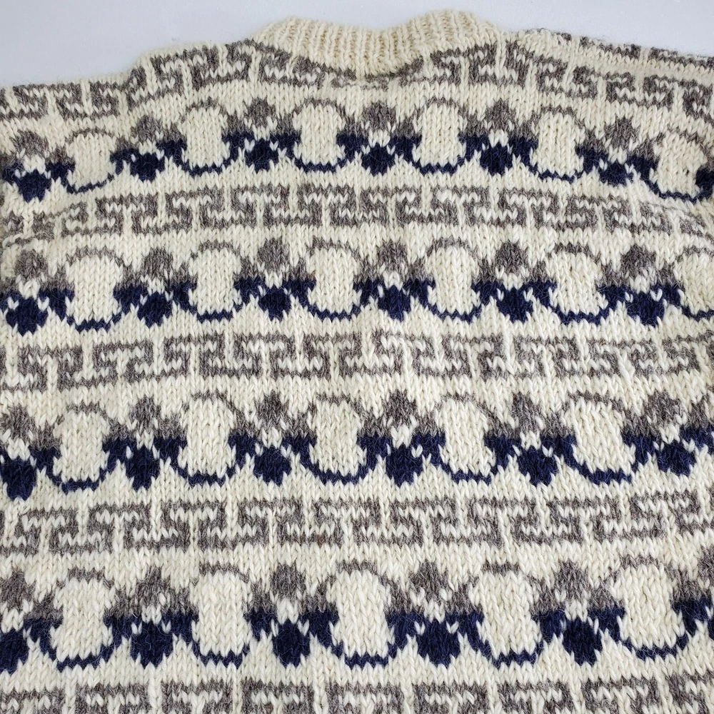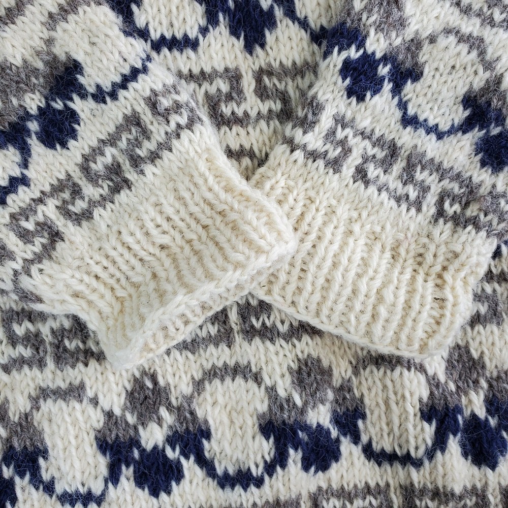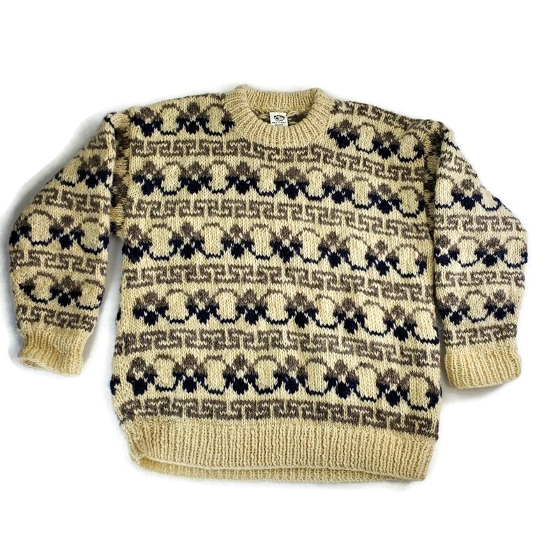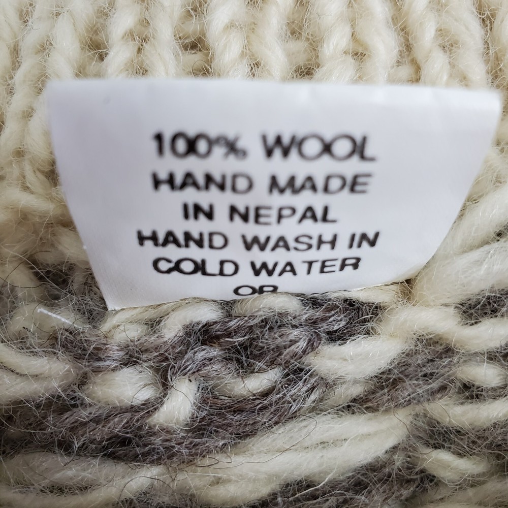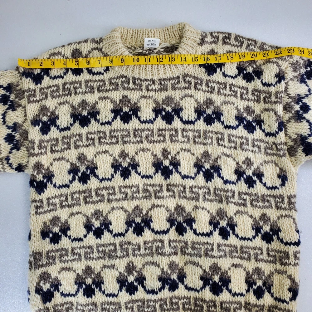 Pole to PoIe Imports Sweater Wool Chunky Knit Nepal Crew Neck Blue Tan Measurements = taken on flat garment Shoulder to Shoulder - 22" Armpit to Armpit - 21" Sleeve Length - 20" Length - 28"...