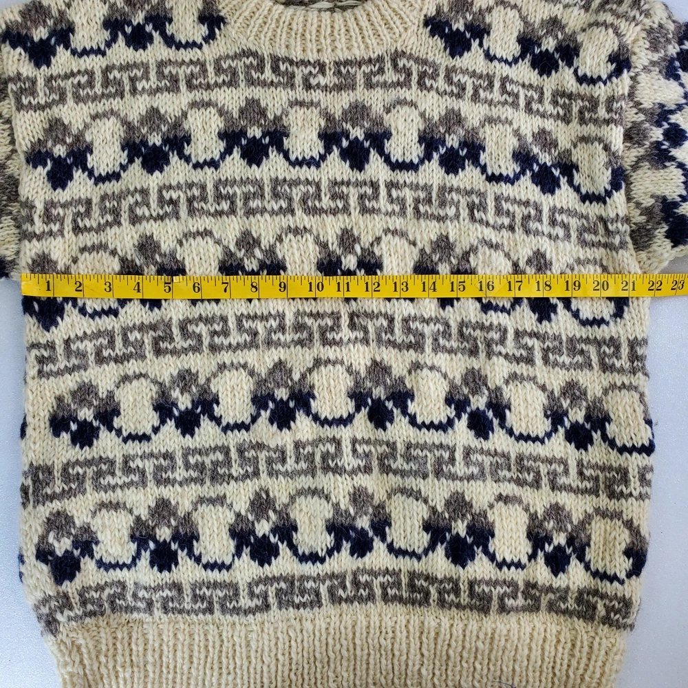 Pole to PoIe Imports Sweater Wool Chunky Knit Nepal Crew Neck Blue Tan Measurements = taken on flat garment Shoulder to Shoulder - 22" Armpit to Armpit - 21" Sleeve Length - 20" Length - 28"