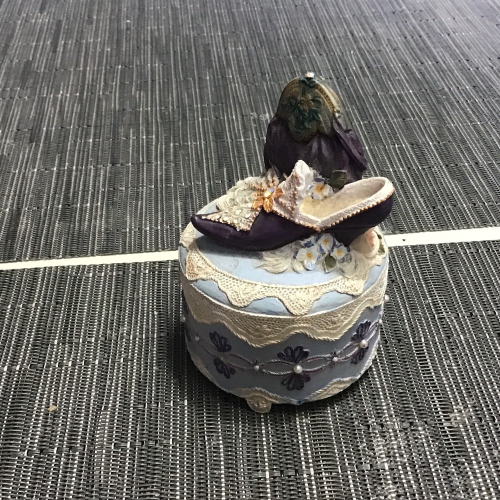 3.5 inches tall decorative miniature music box by popular imports Plays music Topped by shoe and handbag design