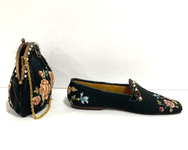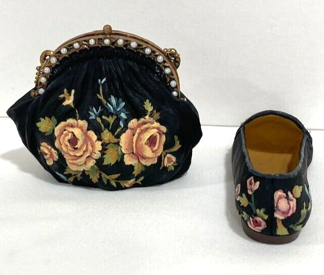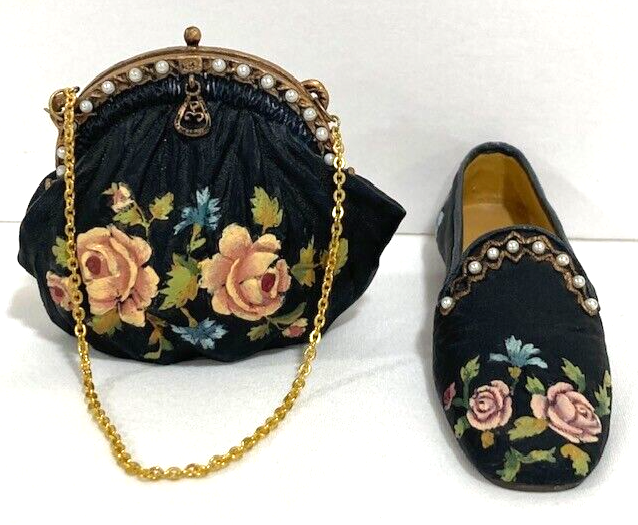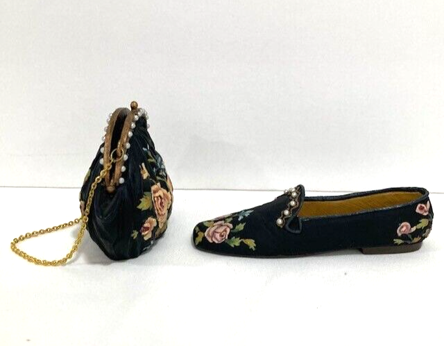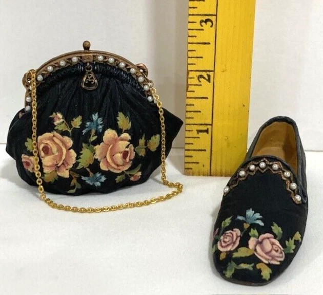 Such a cute miniature set! The tiny black shoe and purse with pink floral detailing are adorable—perfect for dollhouses or display. Even though the shoe is missing a pearl, it adds a bit of charm and uniqueness. Great quality for the price, love the vintage vibe!