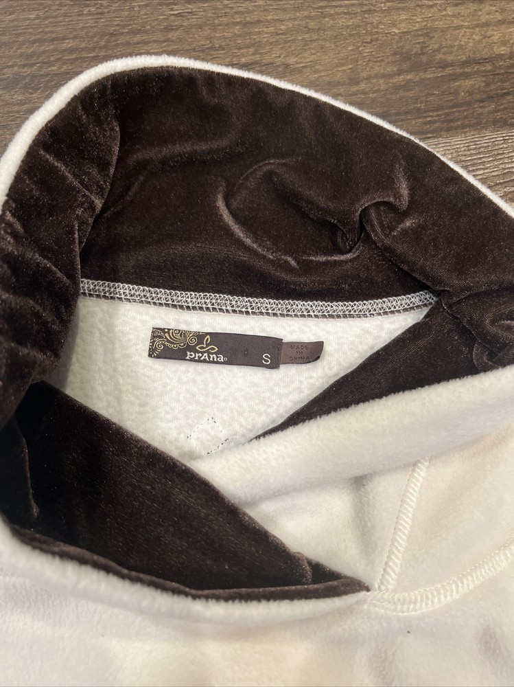This cozy prAna sweatshirt is perfect for any casual or activewear occasion. The white fleece, with brown trim, pullover features a solid pattern and long sleeves. The sweatshirt is made of 100% polyester and has a lightweight feel. It also has an accent logo, a regular fit, and is a women's size small with a regular size type. The sweatshirt is ideal for those who love the cozy theme and is great for layering. The pullover hoodie is perfect for any women's wardrobe and has been crafted with high-quality fabric from China.