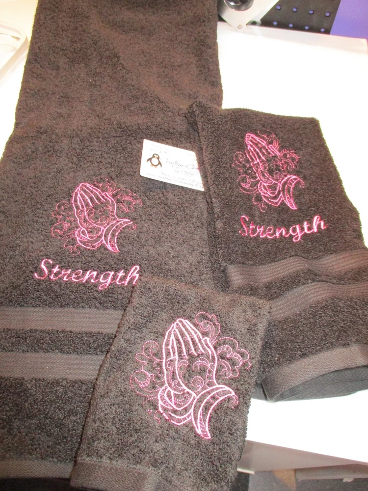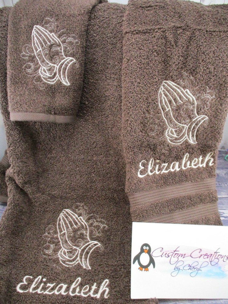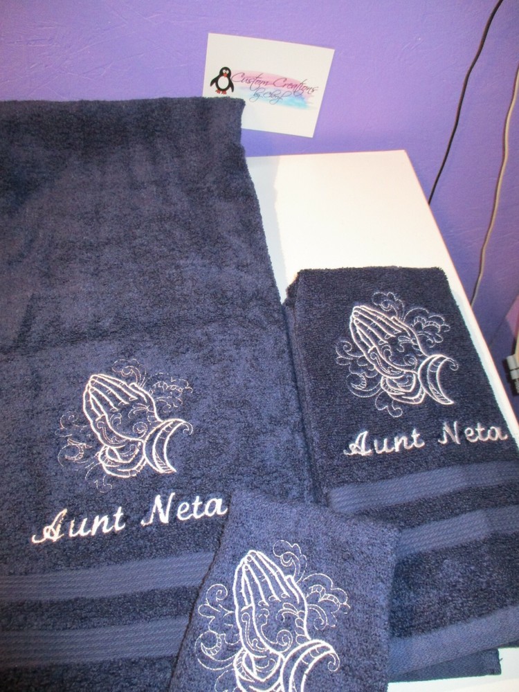 Up for sale on this auction is a really nice PERSONALIZED 3 piece towel set: bath (50 x 26) hand (25 x 16) towel and washcloth combo set. This set is on burgundy towels with white thread but I can do any towel, washcloth and or hand towel color that you would like just leave the info in the comment box when you checkout. I have green, purple, orange, lavender, lime green, turquoise, light pink, tan, chocolate, hot pink, black, gray, white, navy blue, burgundy, red, & royal blue. This design is a praying hands sketch outline. The washcloth is just the designONLY !!! I do have other designs as well. I do have many thread colors to choose from. All of my items are custom made and do come from a smoke free home. I will be more then happy to combine shipping charges. If you do not see a design that you are interested in please ask as I am sure I will have it. Designs range from sports, mascots, kids themes, weddings, teens, and many more.... Please leave the info in the comment box when you checkout. ALL OF MY ITEMS ARE BRAND NEW AND IS MADE TO ORDER IN THE ORDER IT WAS RECEIVED IN !!!! I DO HAVE SHIPPING UPGRADE AVAIL IF YOU WOULD LIKE TO PUSH YOUR ORDER TO THE FRONT OF THE LINE !!! THANKS FOR LOOKING!!!