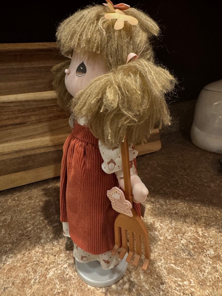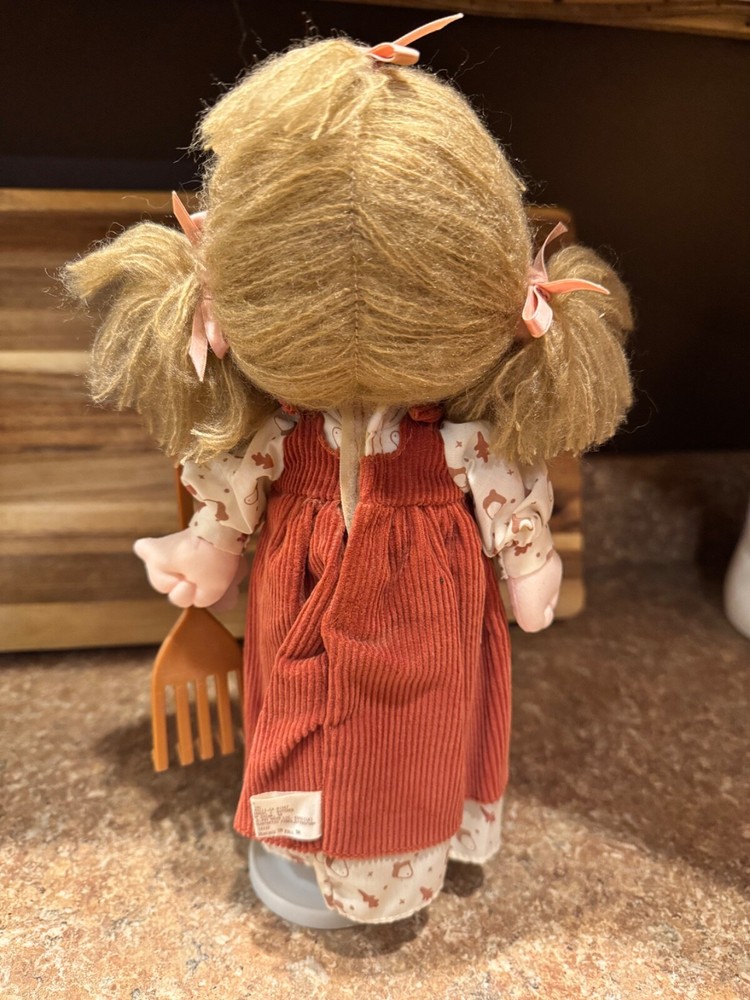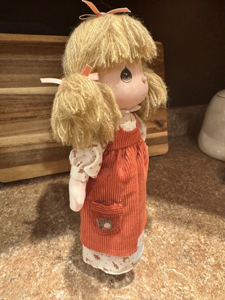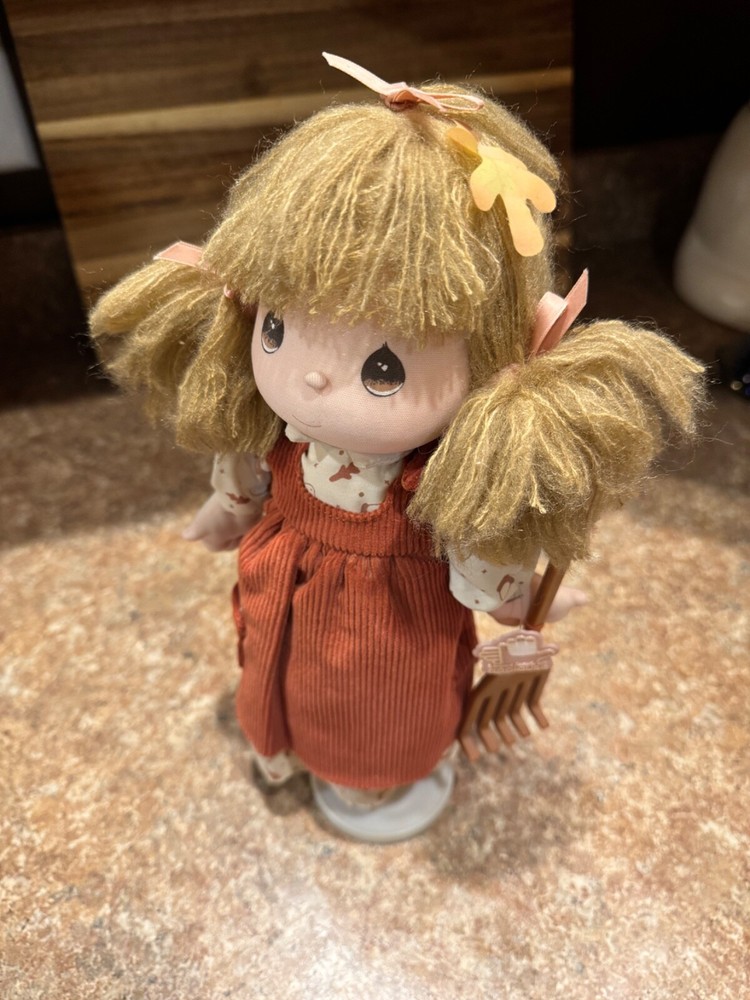 The product is a vintage Precious Moments wind-up doll from the Four Seasons Musical Collection, specifically the Fall 1988 Applause set. The doll is handmade and retired, with straight brown hair and brown eyes. It is an original, licensed reproduction from the 1980s, and comes without packaging. The doll's features include a light complexion and the theme of music. It is a Caucasian girl doll made of cloth, with a characteristically Precious Moments design. Beautiful condition original applause tag still attached.