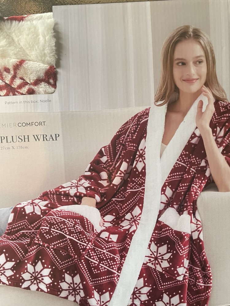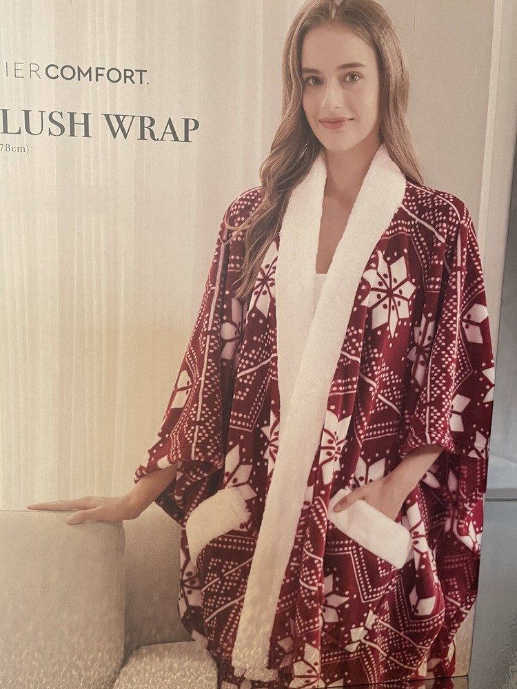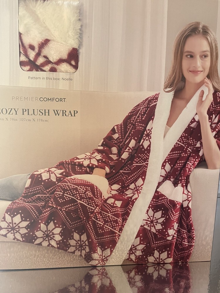 Snuggle in with the cozy feel of this Premier Comfort wrap, in ultra-soft plush with a fun print that makes warmth stylish. Approx. dimensions: 50" x 70" Allover print Oversized pockets with faux-fur trim Polyester Machine wash Imported