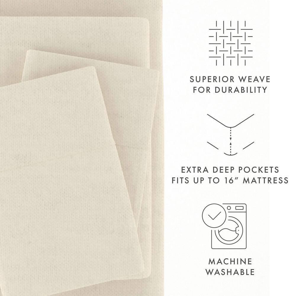 Premium 4-Piece Ivory Ul tra Soft Flannel King Sheet Set Bedding Material: Flannel Care Instructions: Machine Wash Color: Ivory Color Family: White Decor Type: Bedroom Linen Features: Deep Pocket,Easy Care,Hypoallergenic,Machine Washable,Soft Lifestage: Ad ul t Linen Type: Sheet Set Material: Cotton (100%) Number of Pieces: 4 Occasion: Year Round Origin: Imported Pattern Type: Solid Color Pattern/theme: Solid Pocket Depth (in.): 14 in. Returnable : 90-Day Set : Fitted Sheet,Flat Sheet,Pillow cases Size: King Thread Count: 82 Certification s and Listing s: No Certification s or Listing s Sleep soundly in ul timate comfort all through the night in between the coziest flannel sheets ever by ienjoy Home . Made of 100% cotton, these sheets are brushed to bring you super soft and comfy sheets that are machine washable for an easy cl ean . Our Flannel Sheet Set is available in a range of elegant solid colors to enhance the decor of your bedding.