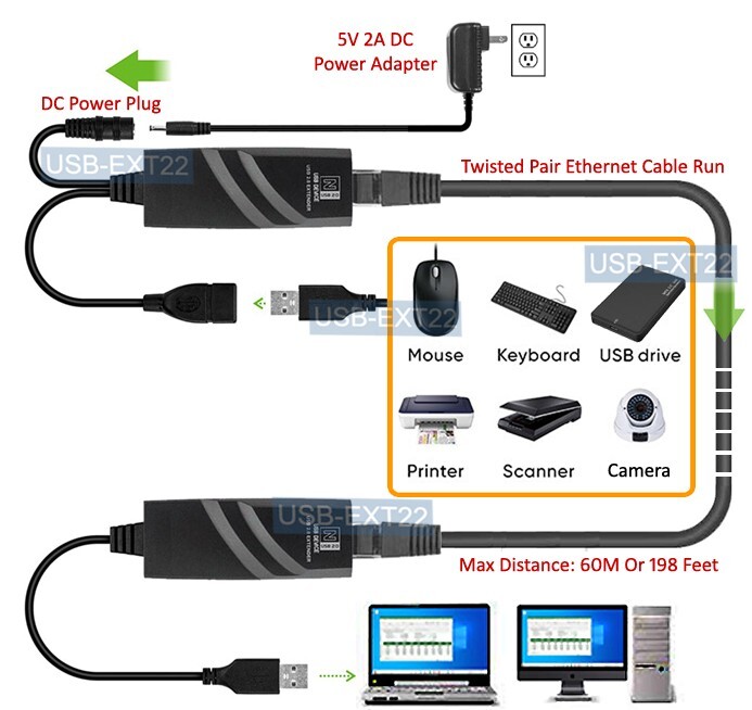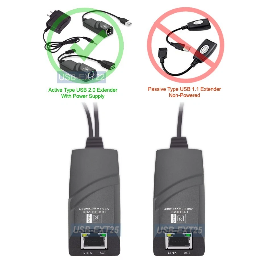 High Speed USB 2.0 Over Cat5 Cat6 Extender Kit With Active Power High Speed USB 2.0 Over Cat5E Cat6 Extender Kit With Active Power This high-performance USB 2.0 over CAT5E or CAT6 extender eliminates the range limit by allowing you to extend USB connection through using low-cost Ethernet cable. It provides USB 2.0 high speed data transfer over long Ethernet cable up to 200 feet or 60 meters for hookup with USB scanner, USB hard drive or flash drive, USB hub or other USB 2.0 devices without any data loss. When connecting with USB 1.1 devices like keyboard, mouse, printer, the maximum range can be up to 320 feet or 100 meters. More importantly this high-speed USB 2.0 active type extender is boosted with external power supply so it can provide sufficient DC power to operate most new USB devices such as hard drive or HD camera and allows for flexibility in equipment placement, not like those non-powered USB 1.1 extenders which can not support connection with USB hard drives, USB cameras, etc. Convenience Fully plug and play. No driver installation needed. Ethernet cables are also easier and more flexible to be concealed and reaching out for much longer cable run for a cleaner, more professional setup. High Performance Active Type USB Extender With Power This is an active USB extender with power solution so it can be used for hookup with USB hard drive or other high-powered USB devices. And the remote USB port of this kit can provide full 500mA power for charging USB device at the far end. Those cheap USB non-powered extender models can not work with USB drive for data transmission and running at slower speed or constant disconnection with USB device. The included DC 5V 2A DC power supply provides sufficient DC power to operate most new USB devices such as hard drive or HD camera and allows for flexibility in equipment placement. Supports All Computer OS This USB 2.0 extender is fully plug and play device regardless of OS type so it supports all computer operating systems including: All PC Windows OS including Win11, Win10, Win 8/8.1, Win7, XP Apple MacOS Linux Premium USB Data Repeater The built-in repeaters of this USB extender provides maximum stability for connecting the computer with USB data storage over the long distance. No data signal loss and ideal for security surveillance video, data storage, PC digital video/ audio systems and other USB peripherals. Low-Cost Cable Solution Maximum Flexibility Cat5/Cat6 twisted pair cables are widely popular and already wired in many households, corporate buildings and campus. They are also more flexible and easier to hide away in offices, buildings and behind walls. And users can easily customize the cable length as needed. Premium USB 2.0 extender over Cat5, Cat5e or Cat6 twisted-pair cable with DC 5V power supply. Active USB extender with power solution so it can be used for hookup with USB hard drive or other high-powered USB devices . Provides full 500mA power for USB bus-powered devices . Ideal for hookup with both USB 2.0 and USB 1.0/1.1 devices such as USB hard drives, USB flash drives, USB cameras, USB KVM switches, USB printers, web cams, keyboard/mouse extensions, and any other USB devices. Maximum USB 2.0 high speed data transmission distance up to 200 feet or 60 meters. Maximum USB 1.1 transmission distance up to 320 feet or 100m . Built-in repeaters of this USB extender provides maximum stability for connecting the computer with USB data storage or USB video camera over the long distanc e . No data signal loss and ideal for security surveillance video, data storage, PC digital video/audio systems and other USB peripherals. Fully plug and play. No driver installation needed. Works with all PC, Mac and Linux OS . High-speed USB 2.0 data transfer at 480Mpbs speed. The included DC 5V 2A DC power supply provides sufficient DC power to operate most new USB devices such as hard drive or HD camera and allows for flexibility in equipment placement . Ethernet cables are easier and more flexible to be concealed and reaching out for much longer cable run for a cleaner, more professional setup. Input/Output Connectors: Local Transmitter Unit: RJ45 port x 1 for CAT5/CAT5e/CAT6 extension cabling USB Type A Male x1 Remote Receiver Unit: RJ45 port x 1 for CAT5/CAT5e/CAT6 extension cabling USB Type A Female x1 Maximum Distance: USB 2.0 up to 60 meters/198 feet or USB 1.1 up to 100 meters/328 feet Transfer Speed: USB 2.0 at 480Mbps External Power Supply: AC power input 110-240V With DC 5V 2A Output USB 2.0 extender kit DC 5V power adapter User manual