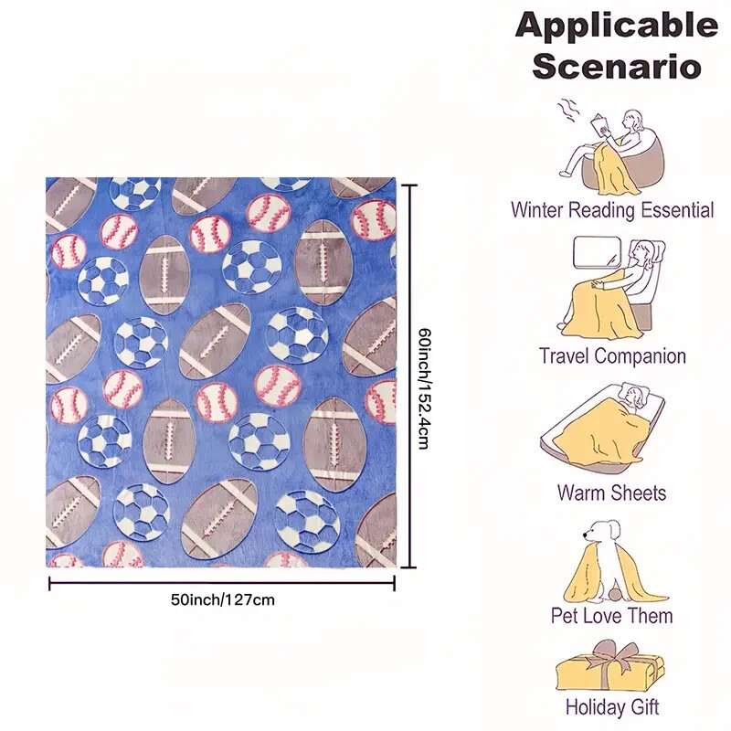 This printed flannel throw is the perfect addition to any room. The cozy and soft blanket is made of 100% polyester and flannel, making it easy to care for and durable. With a mix of colors and a construction truck and sports theme, this rectangular sofa throw is sure to glow in the dark and add a touch of fun to any space. Measuring 59" in length and 51" in width, it's the perfect size for snuggling up under while watching TV or reading a book. Add this unique and fun throw to your home decor collection today! Perfect for every Sportsfan
