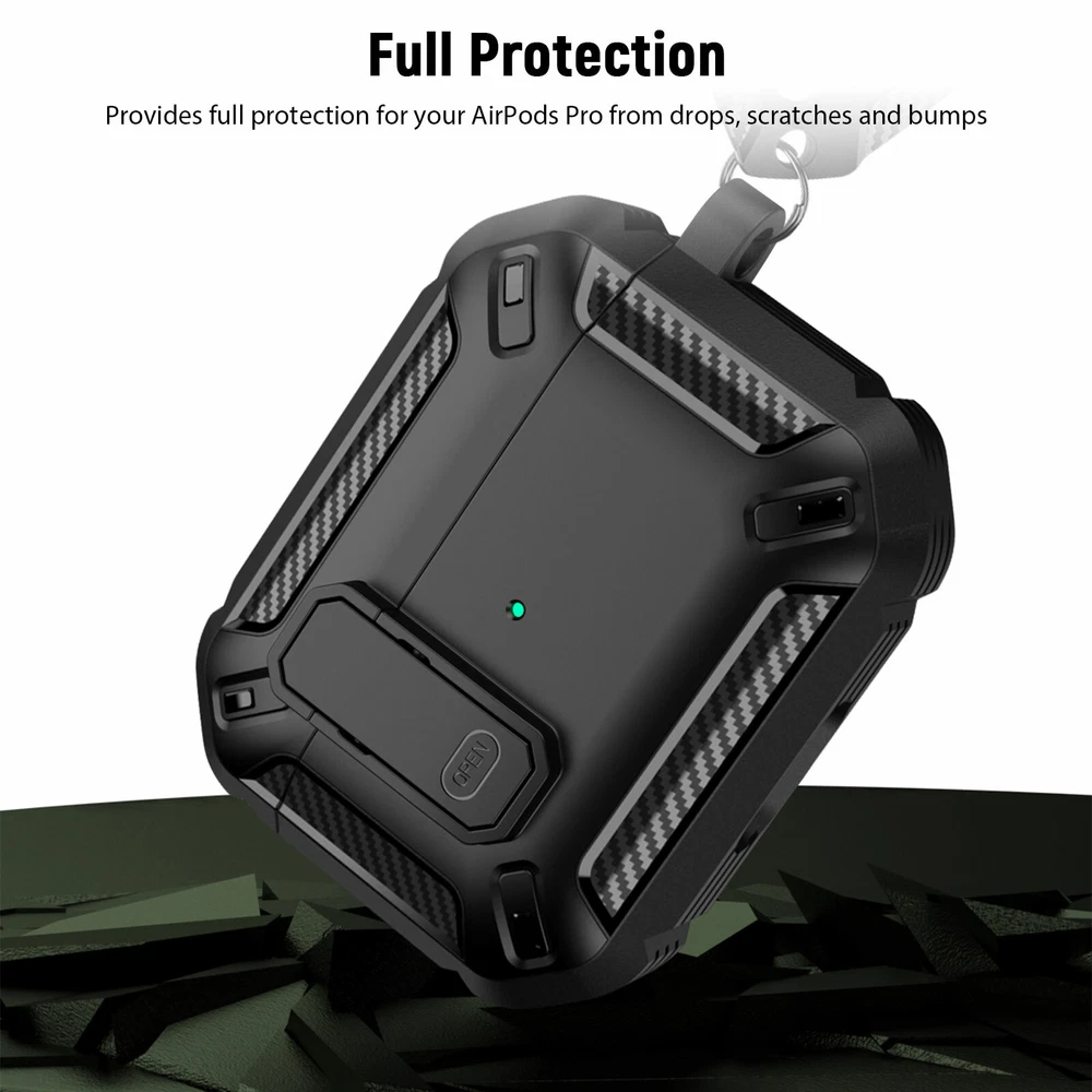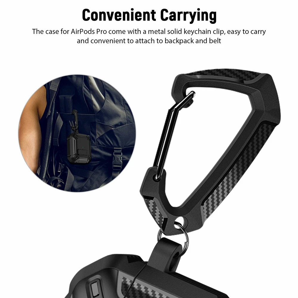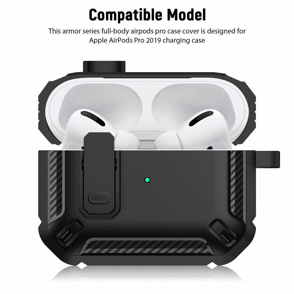 Protect Case for Airpods Pro Main Material: TPU Color: Black Size: 4.8 x 6.5 cm / 1.89 x 2. 56 in Compatible Model: for Apple AirPods Pro 2019 Features: 1. Provides 360-degree full protection, made of military-grade resistant TPU material and with secure lock clip design, which provides full protection for your Airpods pro from drops, scratches and bumps. 2. Take and carry easily, Light weight and come with a metal solid keychain clip , easy to carry and convenient to attach to your backpack and belt. No worry to lose your Airpods pro case. 3.Charge easily, supports wired and wireless charging. No need to remove the AirPod Pro case. Front charging LED light on the case is visible. 4. Completely match, designed for Apple AirPods Pro 2019 charging case, match completely and will protect better. 5. With secure lock design, open and lock easily. It provides better protection for your Airpods Pro from drops. Package included: 1 X Airpods Pro Protect Case 1 X Carabiner Buckle AirPods and Charging devices are NOT included.