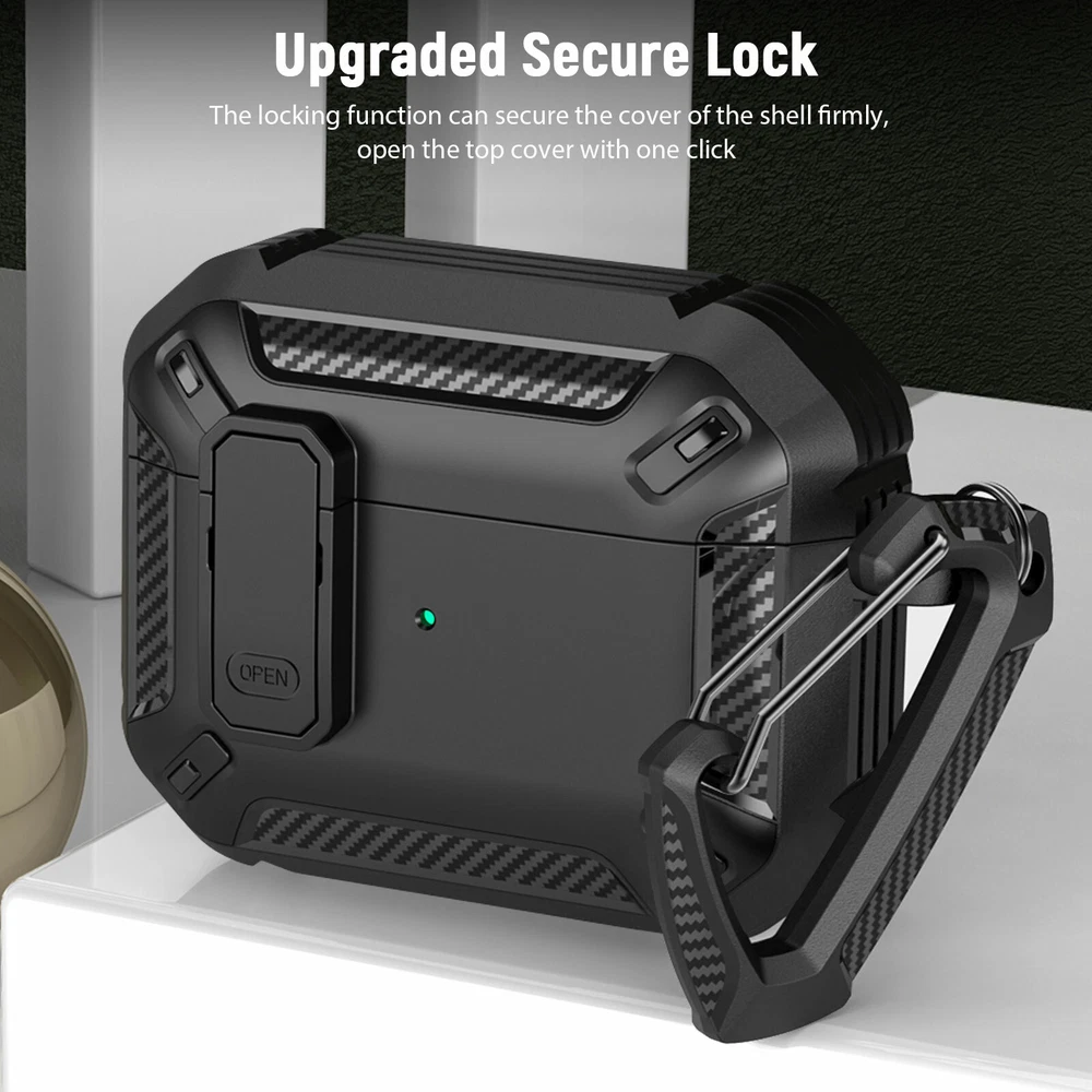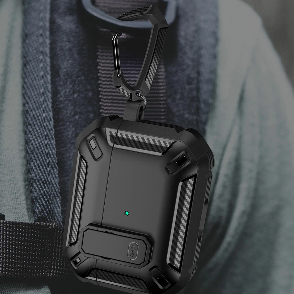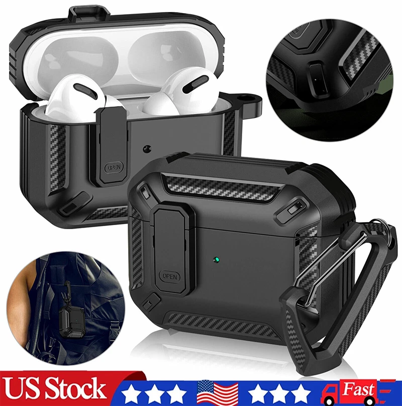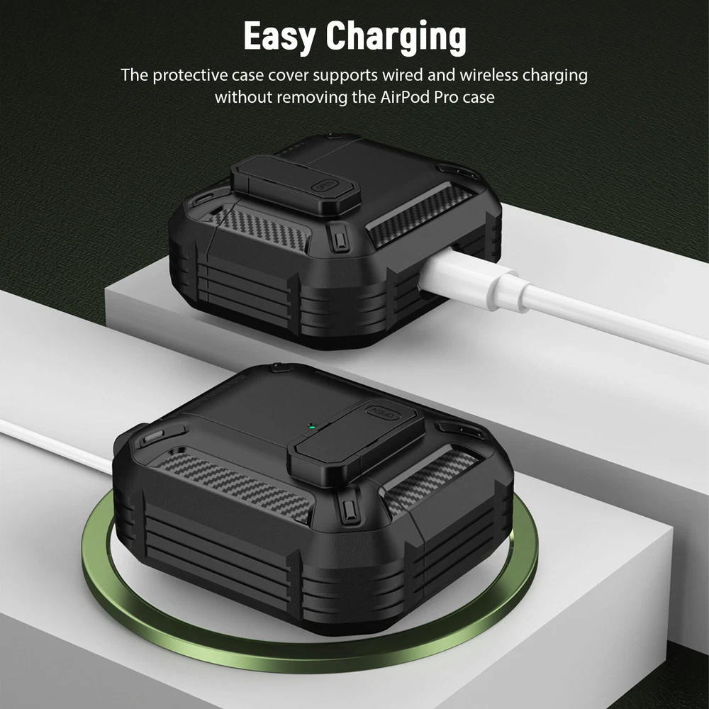 Protect Case for Airpods Pro Main Material: TPU Color: Black Size: 4.8 x 6.5 cm / 1.89 x 2. 56 in Compatible Model: for Apple AirPods Pro 2019 Features: 1. Provides 360-degree full protection, made of military-grade resistant TPU material and with secure lock clip design, which provides full protection for your Airpods pro from drops, scratches and bumps. 2. Take and carry easily, Light weight and come with a metal solid keychain clip , easy to carry and convenient to attach to your backpack and belt. No worry to lose your Airpods pro case. 3.Charge easily, supports wired and wireless charging. No need to remove the AirPod Pro case. Front charging LED light on the case is visible. 4. Completely match, designed for Apple AirPods Pro 2019 charging case, match completely and will protect better. 5. With secure lock design, open and lock easily. It provides better protection for your Airpods Pro from drops. Package included: 1 X Airpods Pro Protect Case 1 X Carabiner Buckle AirPods and Charging devices are NOT included.