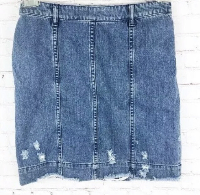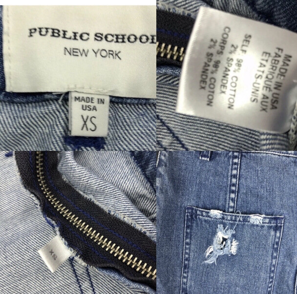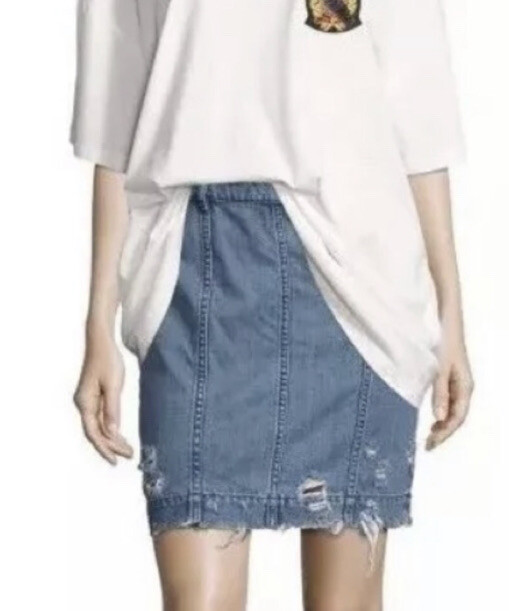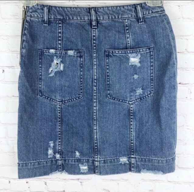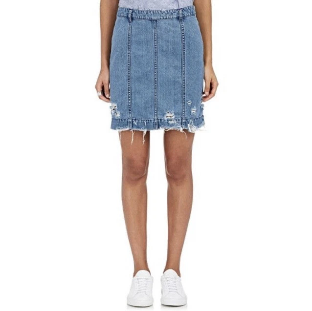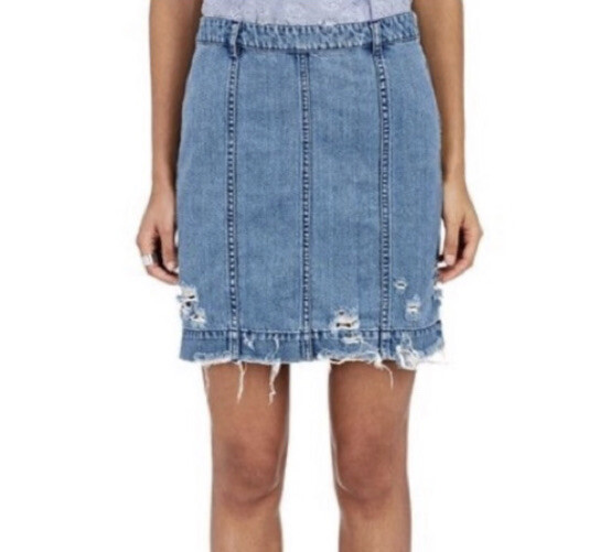 Public School New York Edgar Denim Skirt Factory Distressed Indigo Wash Size XS Measurements approximate laying flat Length: 17" Waist:13" Hip:18" Gently pre-used condition with no visible flaws. Please see all photos for details.