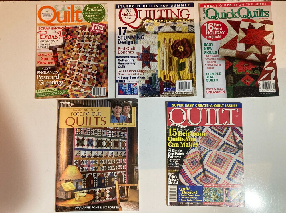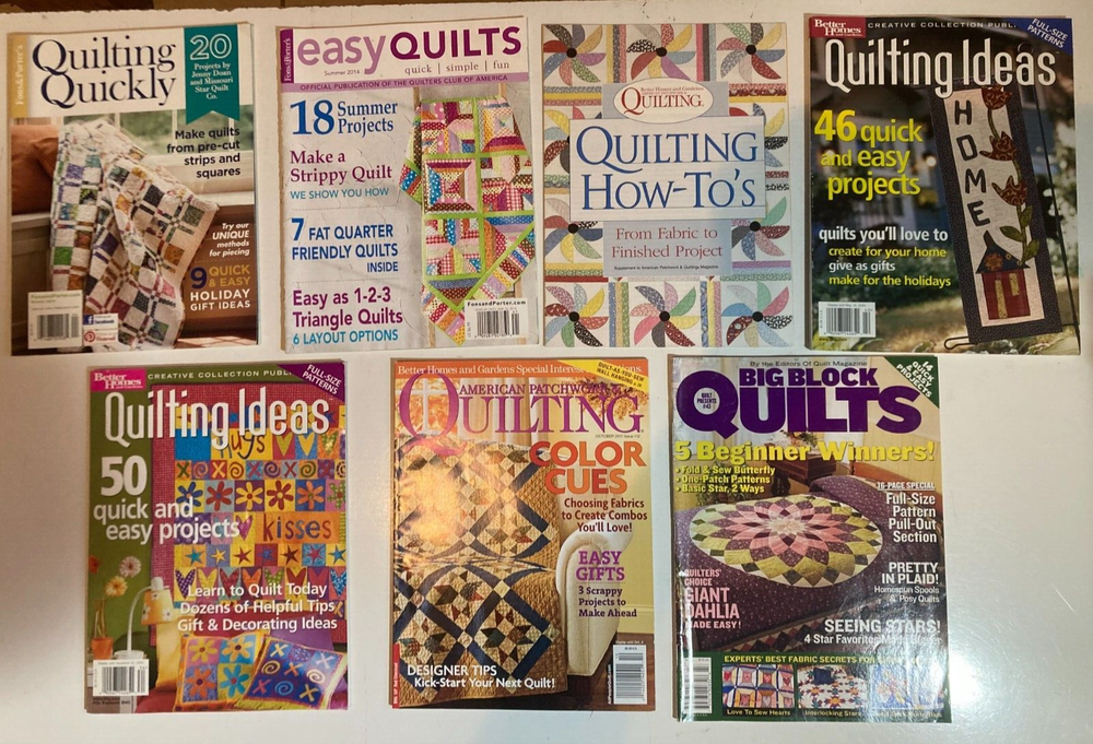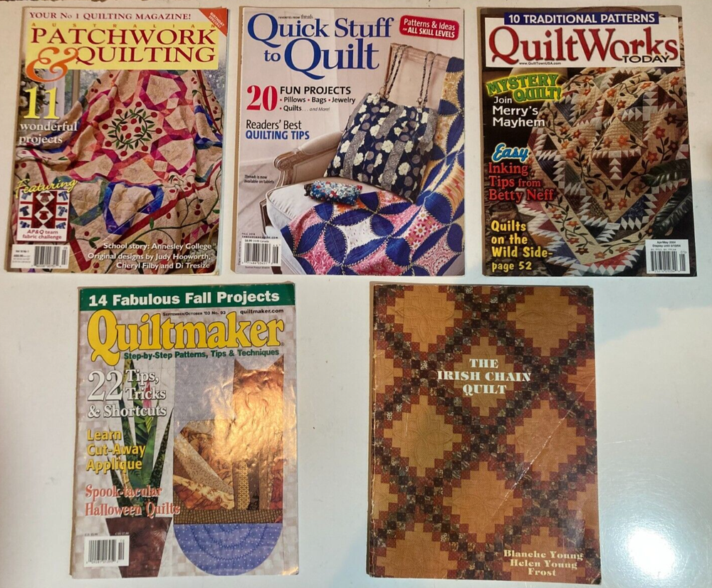 Lot of 17 magazines. FONS & PORTER'S winter 2013 FONS &PORTER'S summer 2014 FONS & PORTER'S supplement, only 15 pages BETTER HOMES May 18, 2004, pull out pattern still attached BETTER HOMES 12/30/03, pull out pattern still attached BETTER HOMES Oct 4 2011 pull out section still attached BIG BLOCK QUILTS #43 1/12/04 pull out section still attached QUILT MAGAZINE 10/12/2009 pull out section still attached, COVER CREASES McCALLS QUILTING 6/3/13 pull out section still attached McCALL'S QUICK QUILTS 12/25/07 pull out section still attached LEISURE ARTS ROTARY CUT QUILTS QUILT MAGAZINE fall 2001 pages tanned with age PATCHWORK & QUILTING Vol 16 #1. pull out section still attached, corner of back cover and last page torn off QUICK STUFF TO QUILT Fall 2014 QUILT WORKS TODAY Apr/May 2004 QUILTMAKER Sept/Oct 2003. cover creases THE IRISH CHAIN QUILT stains on title page. cover creases