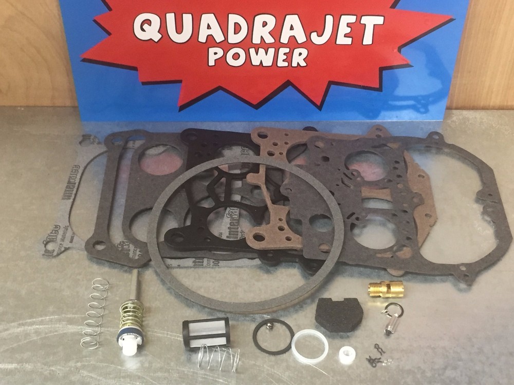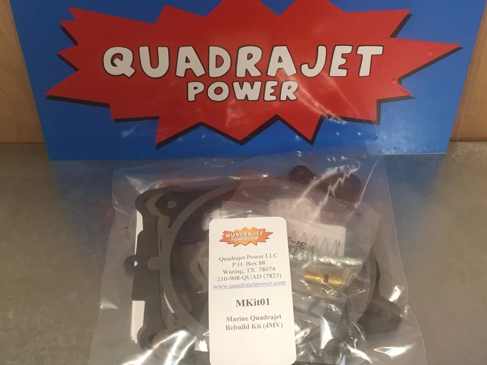 The Best Quadrajet Kit you can buy! Quadrajet Power LLC Your one stop Quadrajet shop Quality Quadrajet parts, new and used Complete Quadrajet services Free shipping Professional Quality Buy from the pros that know your Quadrajet! Highest quality premium rebuild kit you will find. Why? Complete Accelerator pump assembly, ethanol compatible. Not just a cup replacment Thick upper air horn gasket to help seal High flow windowed needle/seat, ethanol compatible All new parts assembled weekly from our supplies. Not sitting on a shelf a few years Hand selected and assembled by our Quadrajet Power LLC team Highest quality components The finest premium quality kit you will find!!! KitM01 Quadrajet Power LLC provides premium quality Quadrajet carburetor rebuild kits. All parts utilized are compatible for use with today's fuels with ethanol. Each kit is assembled from the best individual parts available today. No short cuts or generic pieces. Gaskets are premium quality and thick upper air horn gaskets are used for best seal. Q-Jet carburetor rebuild kit contains the following parts: Flange/base gasket Throttle body gasket Airhorn gasket Thick Carb to Air cleaner gasket Alcohol resistant accelerator pump complete assembly Accelerator pump return spring Accelerator pump check ball High flow Needle and seat assembly and gasket Fuel inlet gasket Assortment of clips Secondary Metering well seal Power piston retainer Choke shaft seals and tube Rochester Quadrajet Application Guide, Reference only: Chris-Craft (8) Chrysler (8) Crusader (8) # 45334 Mercury Marine (4, 6, 8) # 823426A1, 1397-7539, 1397-7540, 1397-7544, 1397-8535, 1397-9723 OMC (8) # 383918, 983864 Volva Penta (8) # 834985-4 The information above for application, shows a general range of vehicles that may use this kit. It is important that you verify your Quadrajet code number. Many vehicles have had the carburetor replaced and may not have original Quadrajet. Verify your Quadrajet production code number!!! Quadrajet Marine carburetors serviced with this rebuild kit: 17057290, 17059280, 17059283, 17059285, 17059286, 17059287, 17059288, 17059289, 17059290, 17059291, 17059292, 17059293, 17059294, 17059295, 17059296, 17059298, 17080560, 17080561, 17080562, 17080563, 17080564, 17080565, 17082403, 17083515, 17083522, 17084001, 17084516, 17085013, 17086069, 17086115, 17086116, 17086117, 17089112, 1347-6492A1, 1347-7361A1, 1347-7362A1, 1347-7363A1, 1347-7364A1, 1347-7365A1, 1347-7366A1, 1347-7498A2, 1347-7498A7, 1347-814623A2, 1347 8288A1, 1347-8289A1, 1347-8290A1, 1347-8291A3, 1347-8292A4, 1347-8296A4, 1347-8588A1, 1347-9142A2, 1347-9415T, 1347-9661A3, 1347-9662A4, 1347-9863A3, 3300-8886A2, 3304-9354A2, 826359-2, 826415-2, 826442-6, 835556-2, 841047-4, 841313-0 Please consider us for Quadrajet services and parts Everything you need for a Quadrajet. Custom Quadrajet service, Quadrajet Parts, Fresh built Quadrajets.