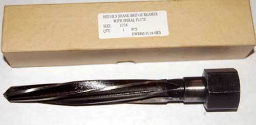 1 Pc. The Best Quality Import Brand New 15/16" x 6-7/8" (OAL) Hex Shank High Speed Steel Bridge Reamer Designed for hard service, these reamers are especially suitable for use in structural iron or steel bridgework and ship construction in lining up bolt or rivet holes. Point is tapered to permit entry into overlapping holes. Short length facilitates use in areas with limited access. Heavy-Duty hex shank designed for portable pneumatic tools. Size Point Dia. Flute Length O.A.L Part Number 15/16 1-7/16 5 6-7/8 DWRRB15/16HEX