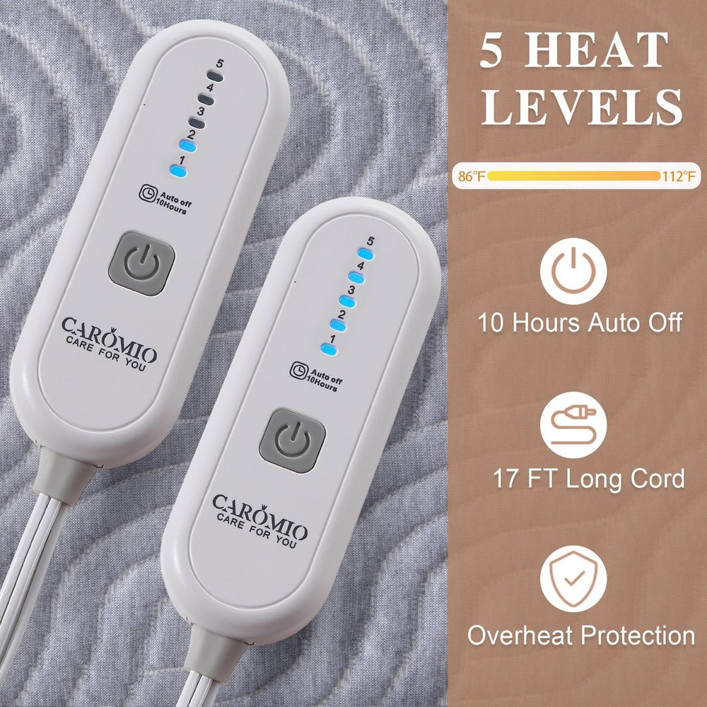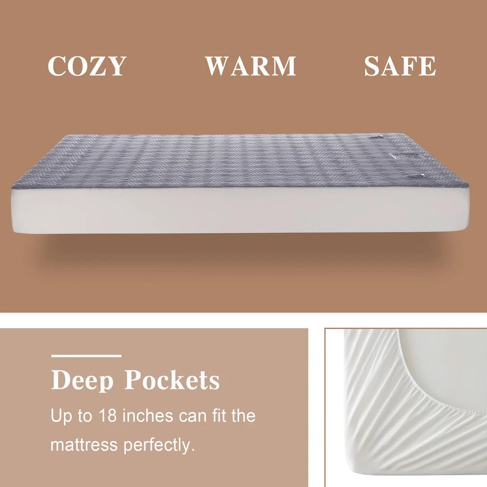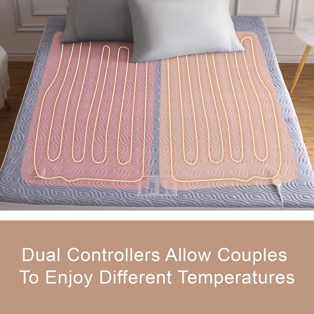 【Comfortable & Cozy 】Enjoy the ultimate comfort and warmth with the heated mattress pad, designed with airlayer fabric to provide a soft and resilient sleeping surface. The unique ventilation technology ensures breathability for a more relaxed sleep experience. 【Cozy Nights for Two】Say goodbye to cold nights with queen size heated mattress pad. With dual control, both partners can customize their own warmth with 5 heating levels (90℉-112℉). Quickly warm up in just 20 minutes for a cozy, comfortable sleep all night long. 【Flexible Placement】The deep pockets up to 18 inches provide a perfect fit for your mattress, and the all-around skirt with strong elastic ensures it stays securely in place. With the 10FT long power cord, the controller can be placed anywhere on your bed for added convenience. 【Safe and Secure】Sleep soundly knowing that your electric mattress pad is ETL certified, with overheating protection and a 10-hour auto shut off for added safety and energy efficiency. No need to worry about forgetting to turn off the power. 【Machine Washable】Maintain the quality of your heated mattress pad with ease, simply disconnect the controller and wash it on a gentle cycle in cold water. Dry on a gentle, cool cycle or hang to dry. For best results, reshape it to its original size after washing.