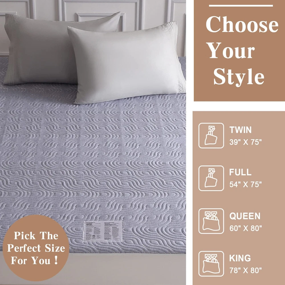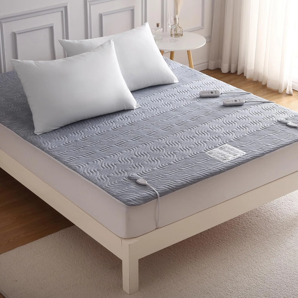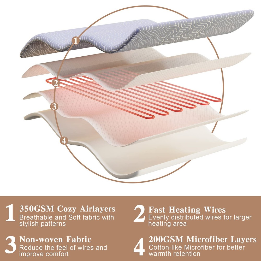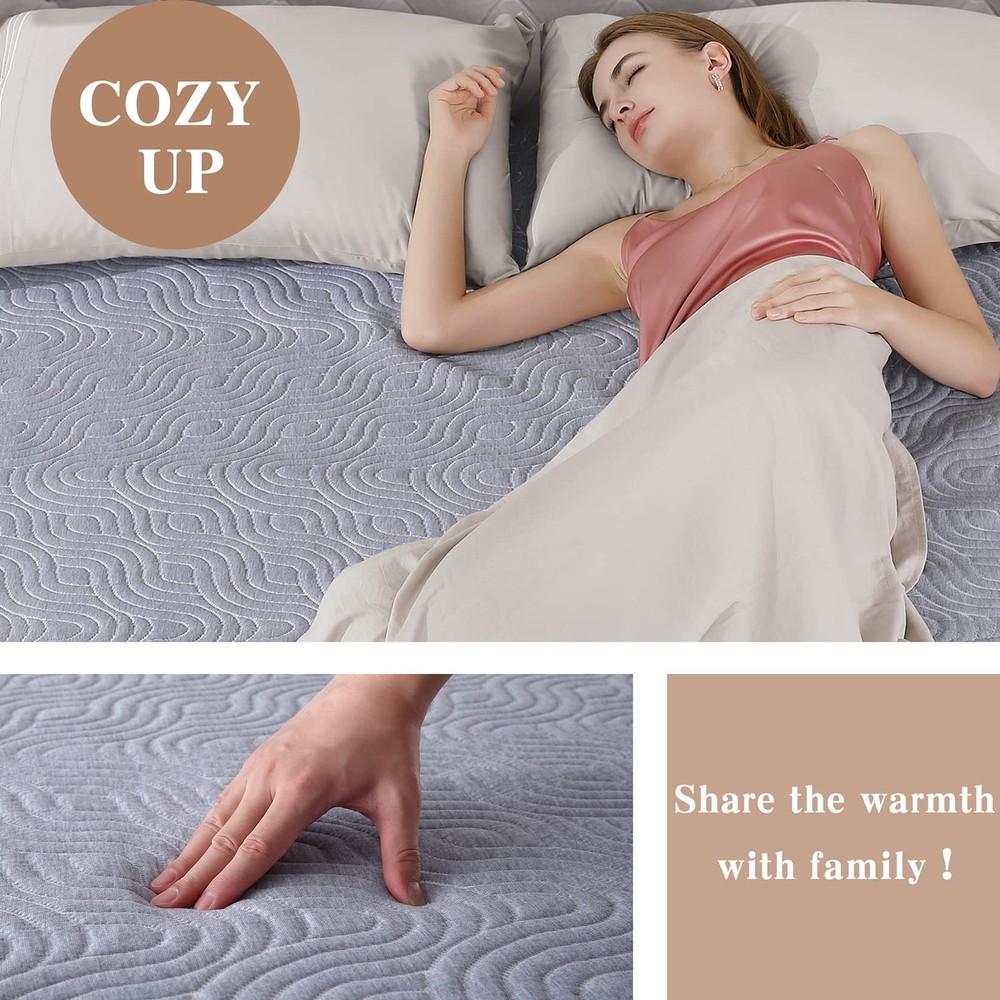 【Comfortable & Cozy 】Enjoy the ultimate comfort and warmth with the heated mattress pad, designed with airlayer fabric to provide a soft and resilient sleeping surface. The unique ventilation technology ensures breathability for a more relaxed sleep experience. 【Cozy Nights for Two】Say goodbye to cold nights with queen size heated mattress pad. With dual control, both partners can customize their own warmth with 5 heating levels (90℉-112℉). Quickly warm up in just 20 minutes for a cozy, comfortable sleep all night long. 【Flexible Placement】The deep pockets up to 18 inches provide a perfect fit for your mattress, and the all-around skirt with strong elastic ensures it stays securely in place. With the 10FT long power cord, the controller can be placed anywhere on your bed for added convenience. 【Safe and Secure】Sleep soundly knowing that your electric mattress pad is ETL certified, with overheating protection and a 10-hour auto shut off for added safety and energy efficiency. No need to worry about forgetting to turn off the power. 【Machine Washable】Maintain the quality of your heated mattress pad with ease, simply disconnect the controller and wash it on a gentle cycle in cold water. Dry on a gentle, cool cycle or hang to dry. For best results, reshape it to its original size after washing.
