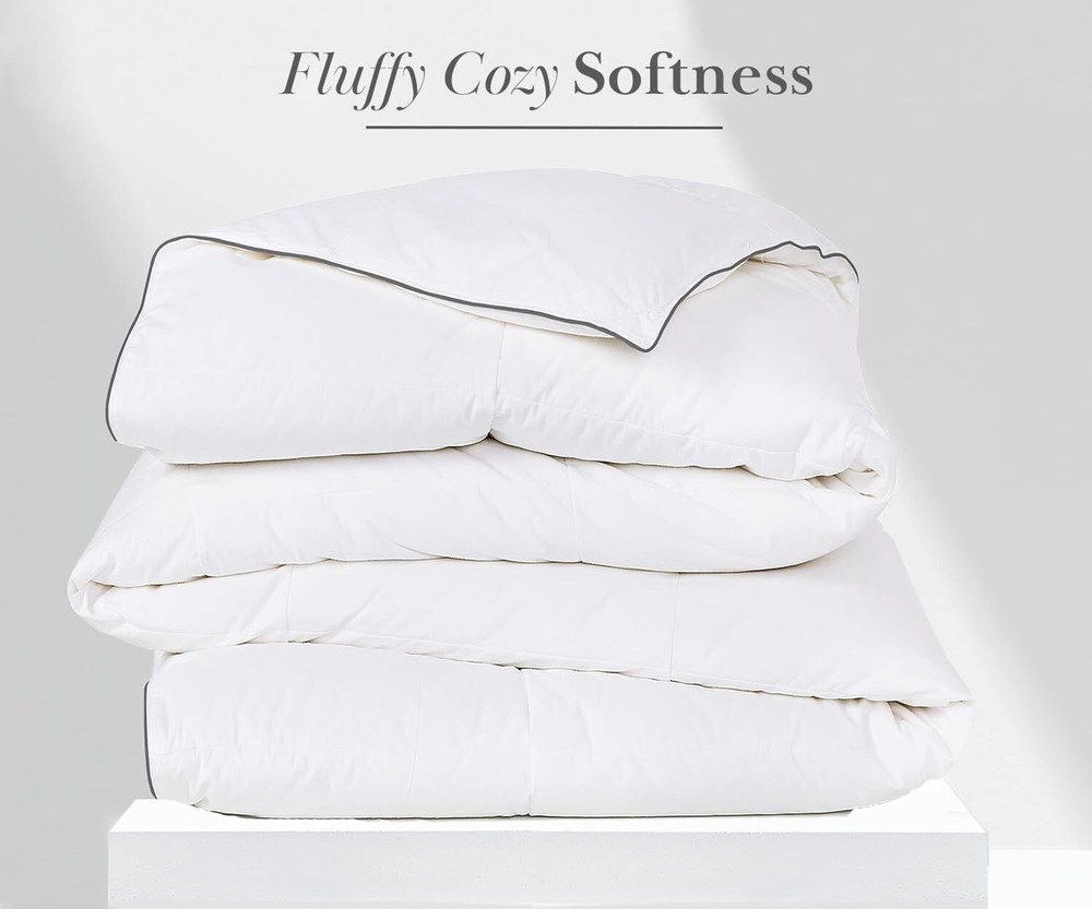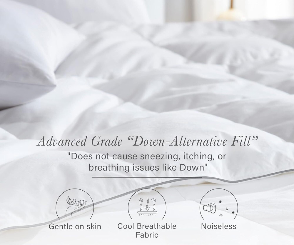 All-Season Luxury Comforter - Snuggle up in ultimate comfort with our queen size cozy luxury comforter, crafted from silky, soft cooling fabric and filled with high-quality, fluffy down-alternative for balanced, all-season warmth—not too light or heavy. Features corner hooks for secure duvet cover attachment. True Queen Size: 90 inch x 90 inch. Easy to Use & Maintain - Our queen size duvet insert is extra fluffy with corner hooks for attaching to duvet cover ties, ensuring it stays in place all night. Pairs perfectly with our luxury cotton duvet covers (sold separately). Machine washable and dryer friendly. Affordable Luxury Bedding - Indulge in the luxury of a real down comforter without breaking the bank. Our king down-alternative duvet insert looks and feels like real down, perfect for families wanting luxury without maintenance or potential health issues. Expertly Crafted Quilting - Say goodbye to filling leaks, rips, and uneven fill with our expertly crafted comforter. High-quality stitching, box quilting, and all-around silver piping ensure no fill shifting. Soft, cooling, and noiseless fabric for peaceful sleep.