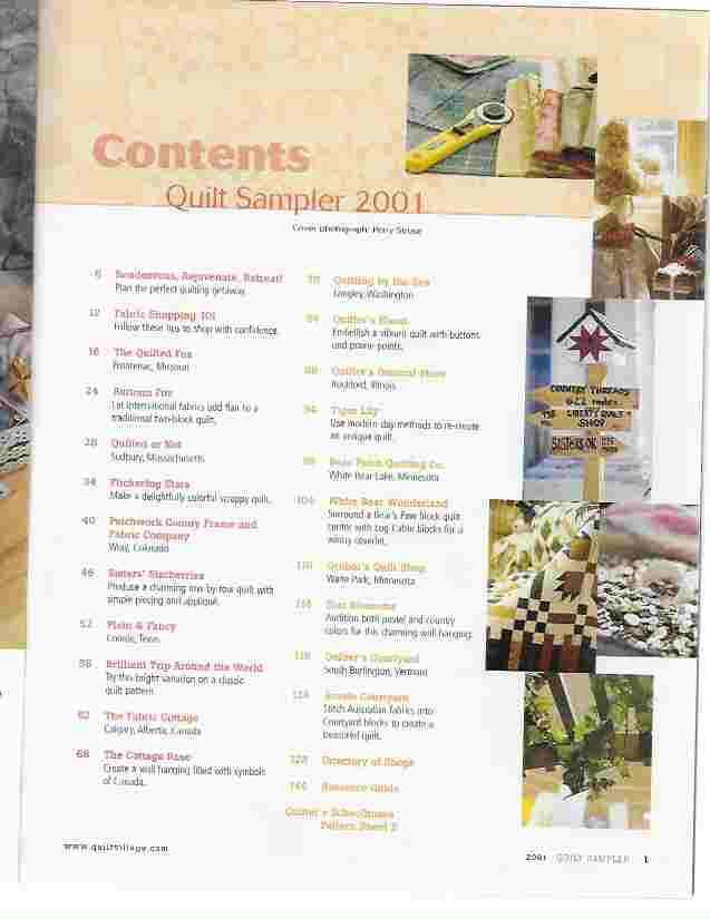 Used in good condition Quilt Sampler Magazine 2001 144 pages Complete instructions and patterns for completing various items. I will combine shipping to help save you on cost. If you have several items that you are purchasing, just request a revised invoice and I will provide you one with combined shipping costs.