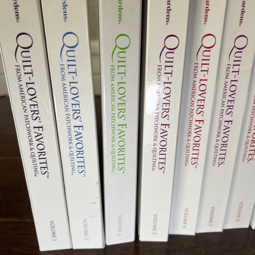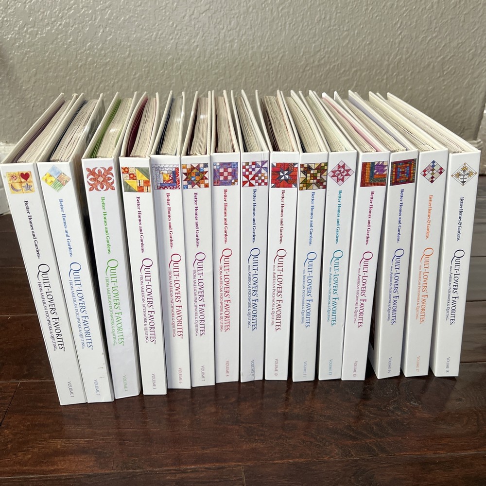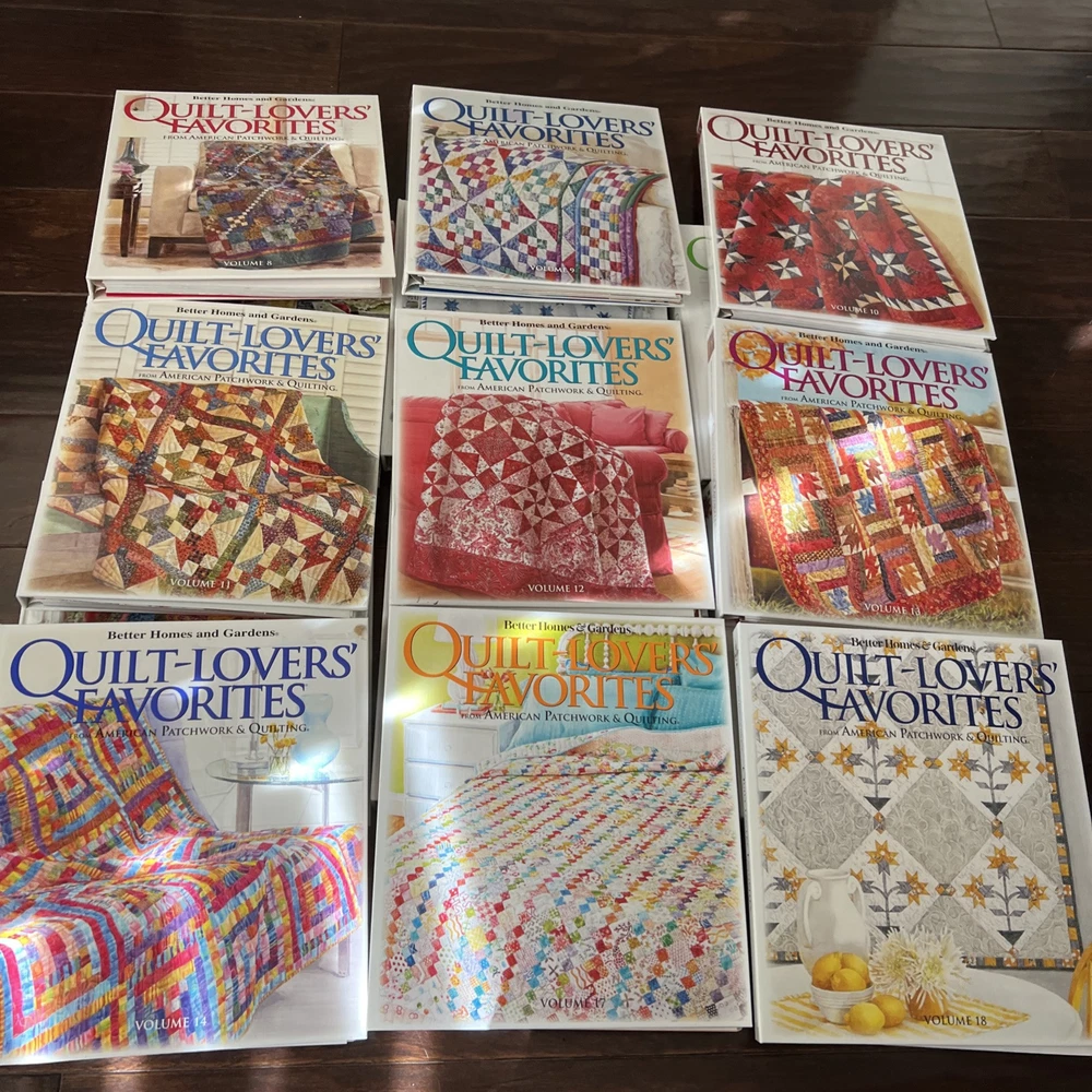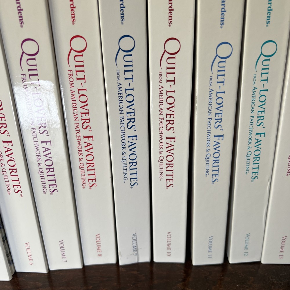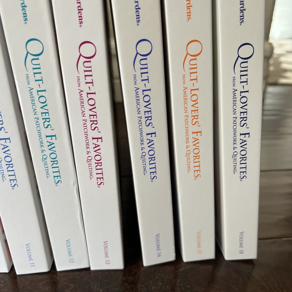 In very good to like new used condition. All with patterns and some with extra inserts like quilt journals. Volumes 1, 2, 4-14, 17, 18.