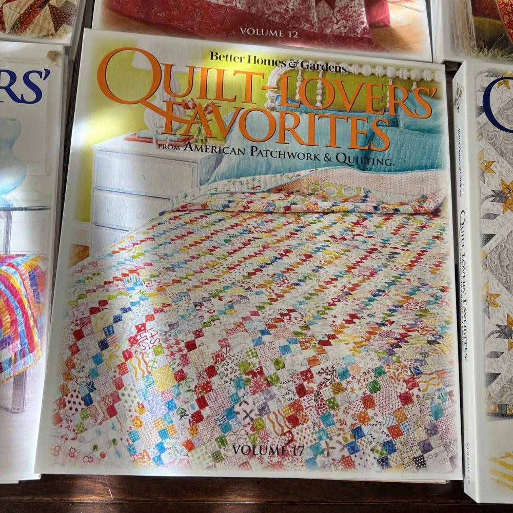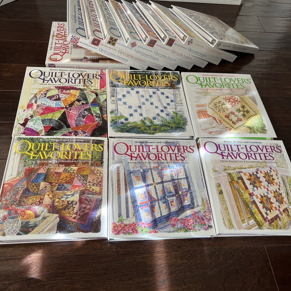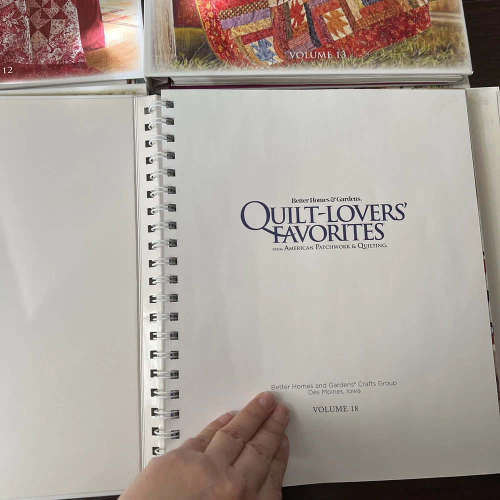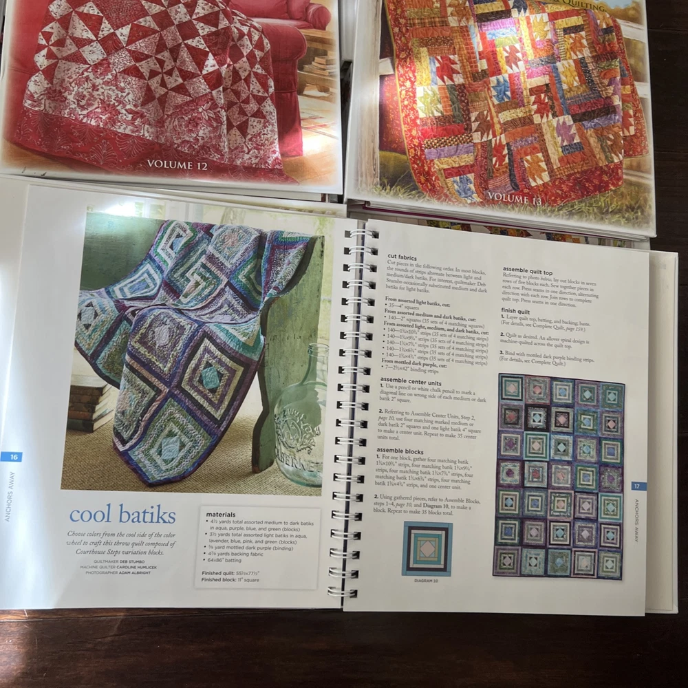 In very good to like new used condition. All with patterns and some with extra inserts like quilt journals. Volumes 1, 2, 4-14, 17, 18.