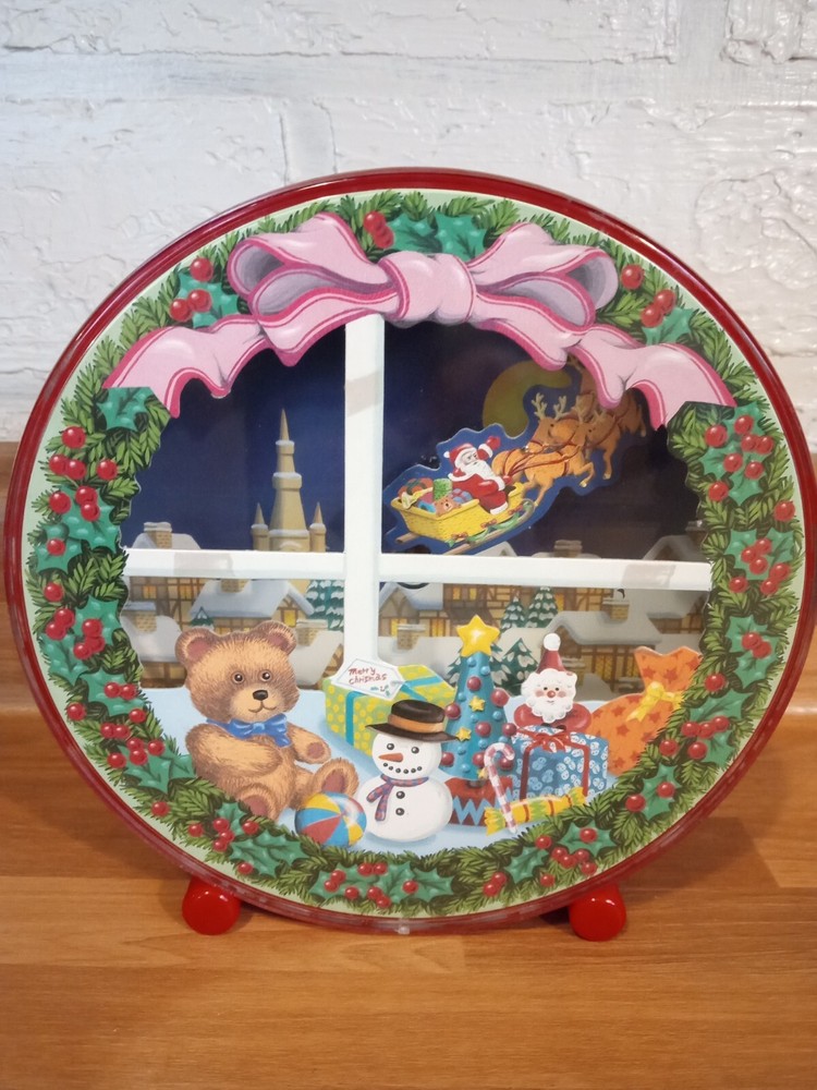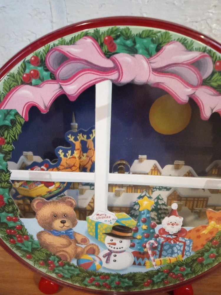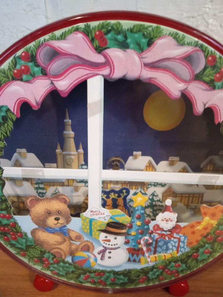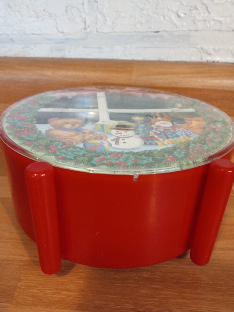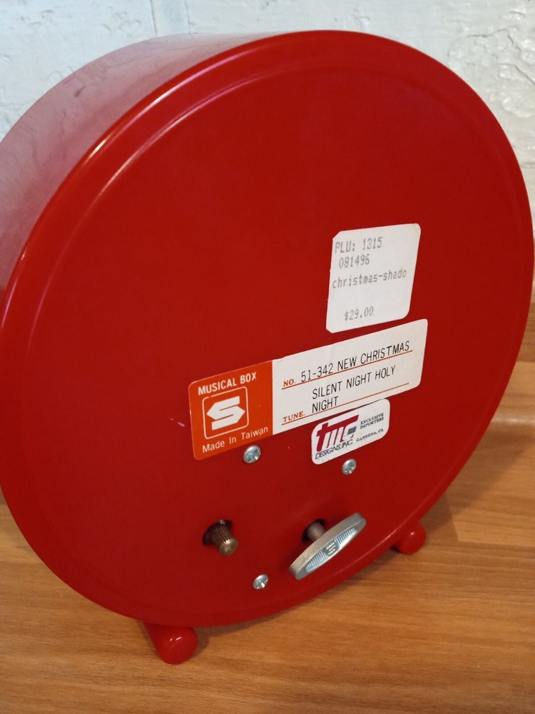 Rare Vintage Christmas Animated Music Box Wind Up Santa's Sleigh "Silent Night". Wind up the music box to hear the melody play as Santa and his Reindeer fly over the town on Christmas nice. Santa circles the piece like a hand on a clock, disappearing behind the toys and coming back up to fly over the town again. Very nice condition and working properly. 6" tall x 2.5" thick.