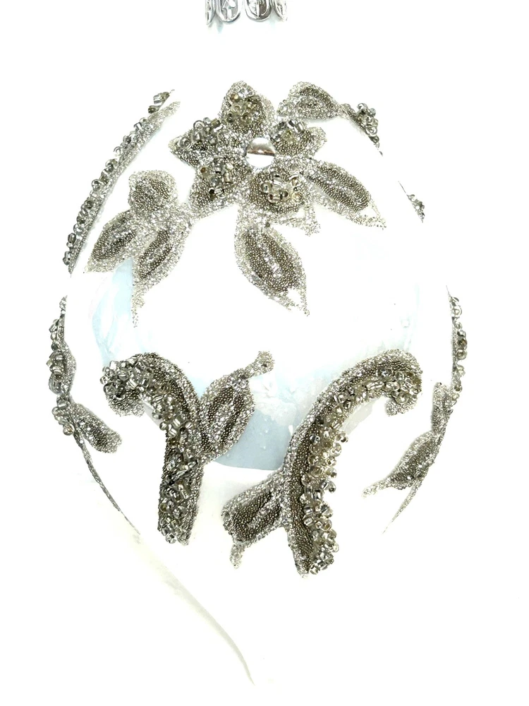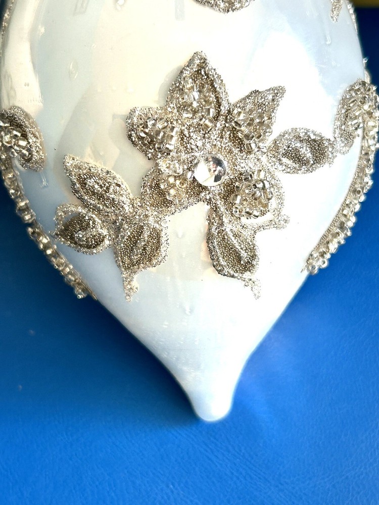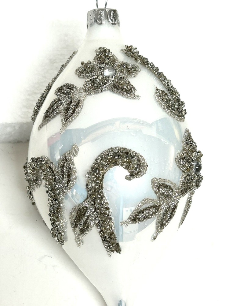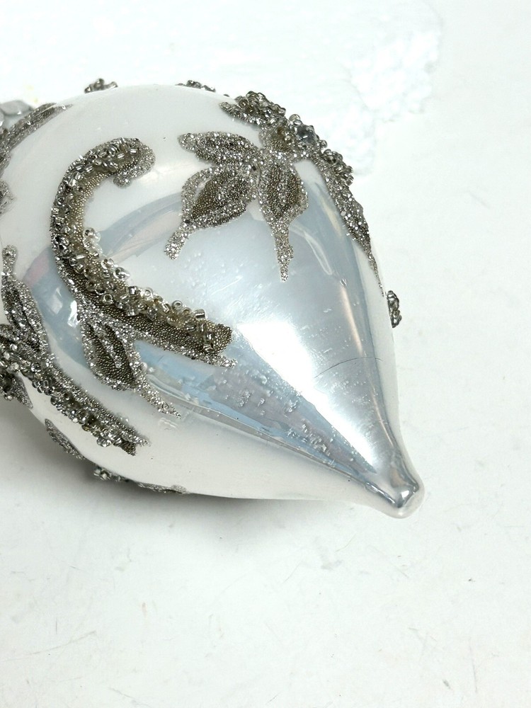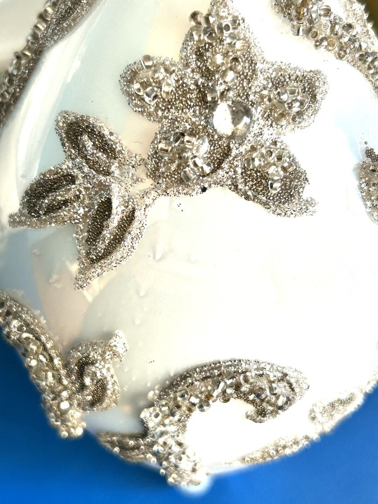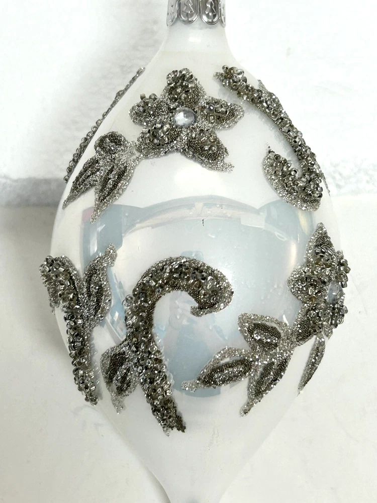 VINTAGE RAZ IMPORTS GLASS CHRISTMAS ORNAMENT WHITE WITH A SILVER ENCRUSTED DESIGN 6 INCHES NO CRACKS IN GREAT CONDITION PICTURES ARE PART OF THE DESCRIPTION PLEASE CHECK OUT MY STORE, SO MANY ITEMS FROM THE PAST DESIGNER CLOTHES, SHOES & PURSES, SUNGLASSES ETC- A LOT NOT LISTED,PLEASE ASK IF LOOKING FOR A DESIGNER I DO COMBINE SHIPPING IF POSSIBLE I SHIP IMMEDIATELY UPON RECEIPT OF YOUR PAYMENT SO BE SURE TO CONTACT ME AHEAD OF TIME & LET ME KNOW IF YOU ARE STILL SHOPPING I SHIP USING USPS WITH SAME DAY OR ONE DAY HANDLING. I DO NOT MAKE MONEY ON THE SHIPPING COSTS AND IS BASED ON PRICES QUOTED AT THE USPS SITE FOR ACTUAL SHIPPING COSTS. I USE RECYCLED BOXES AND PACKING MATERIALS. ALSO NEW STURDY BOXES ITEMS WILL BE WELL PACKED, YOU WILL HAVE TRACKING NUMBER. I WILL ISSUE A REFUND WHEN EXTRA MONEY IS PAID FEEDBACK: I DO NOT LEAVE FEEDBACK UNTIL I RECEIVE YOURS. THIS IS THE ONLY WAY I KNOW YOU RECEIVED THE ITEM AND ARE HAPPY WITH MY SERVICE. IF YOU ARE NOT HAPPY PLEASE CONTACT ME BEFORE LEAVING FEEDBACK SO WE CAN WORK THE PROBLEM OUT. YOUR BUSINESS IS MUCH APPRECIATED I TRY TO DESCRIBE MY ITEMS AS HONESTLY, CLEARLY AND ACCURATELY AS POSSIBLE BUT BEAR IN MIND, I AM NOT A DEALER OR SPECIALIST. I LET YOU KNOW EXACTLY WHAT I WOULD WANT TO KNOW IF I WAS BUYING. COLORS MAY VARY SLIGHTLY DUE TO LIGHTING OR FLASH. I SOMETIME WILL ADD AN PICTURE WITH EXTRA LIGHT TO SHOW YOU THE DETAILS. IF YOU HAVE ANY QUESTIONS, OR WANT MORE PICTURES, PLEASE DON'T HESITATE TO ASK. MOST OF MY ITEMS ARE FROM OUR FAMILY HOUSES. I DO NOT CLEAN OR REPAIR ANY PIECES AND DO MY BEST TO DESCRIBE EXACTLY WHAT I SEE. IF I DO ANYTHING, I WILL LET YOU KNOW HAVE BEEN PACKED AWAY FOR YEARS. IF ANY REPAIRS HAVE BEEN DONE, IT WAS DONE BACK THEN. I WILL POINT OUT EVERYTHING THAT I NOTICE. A BUYER OF VINTAGE OBJECTS SHOULD ASSUME THAT VINTAGE AND ANTIQUE ITEMS ARE NOT ALWAYS PERFECT AND MAY SHOW SOME SIGNS OF AGE OR WEAR SUCH AS PATINA I DO MY BEST TO OFFER YOU AN EXPERIENCE THAT IS PROFESSIONAL AND QUALITY GRADED. I WOULD WANT THE SAME FOR MYSELF THEREFORE I EXPECT TO GIVE YOU JUST THE SAME. Track Page Views With Auctiva's Counter