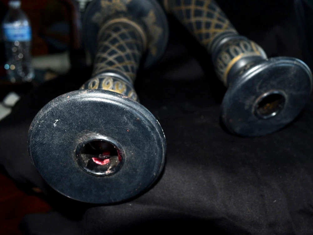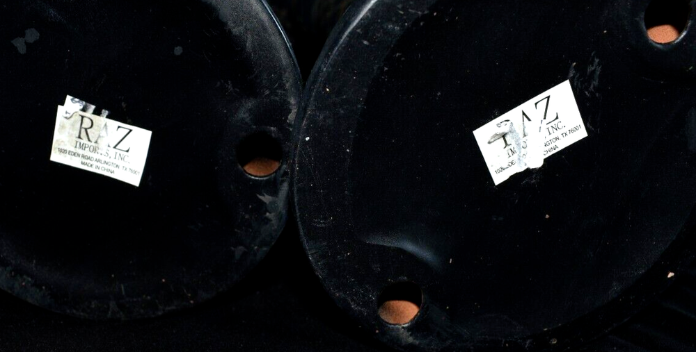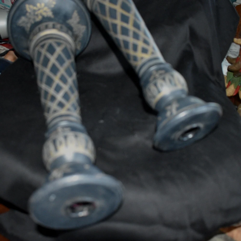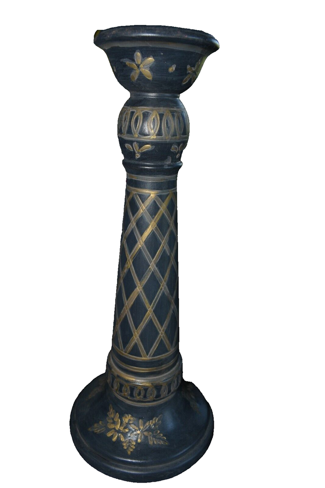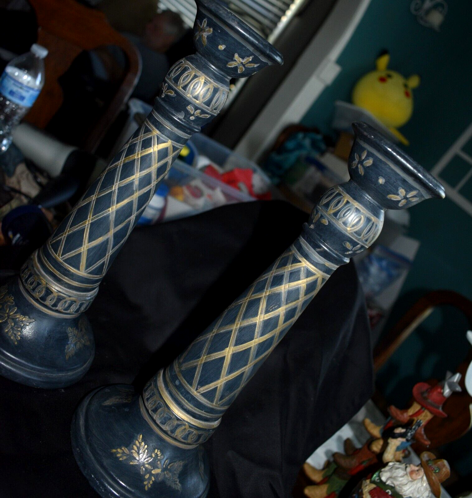 RAZ Imports Brand 2 Candle Holders Lightweight Navy W/ Gold Design on each Measurements : 12" Tall 5"Diameter At Bottom 3" At Top Of holder. Fits tapered candles. China Excellent Condition See Photos.