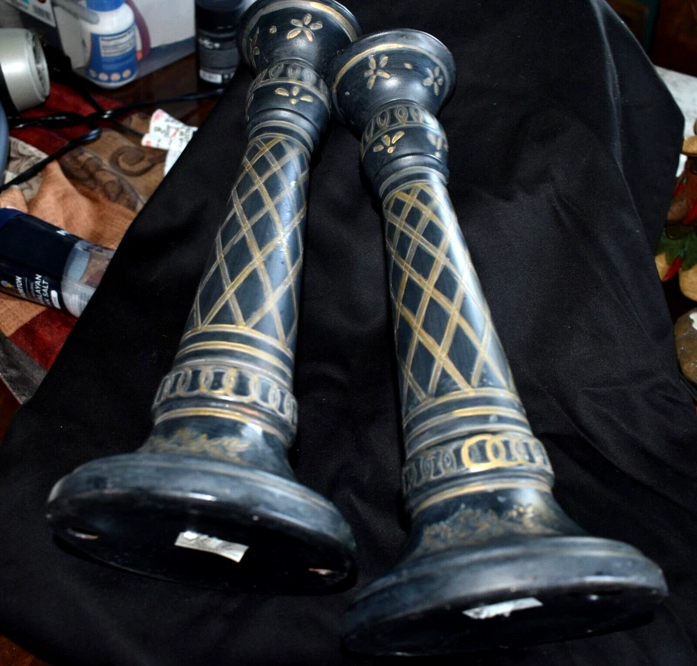RAZ Imports Brand 2 Candle Holders Lightweight Navy W/ Gold Design on each Measurements : 12" Tall 5"Diameter At Bottom 3" At Top Of holder. Fits tapered candles. China Excellent Condition See Photos....