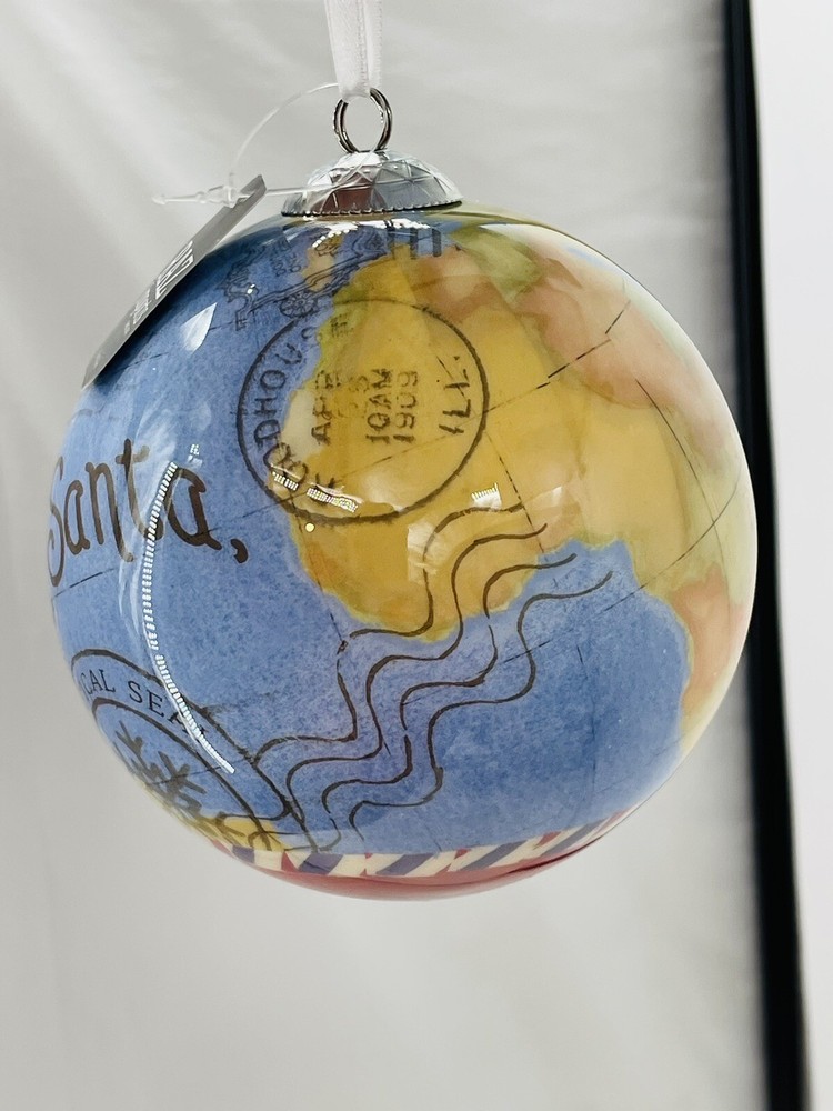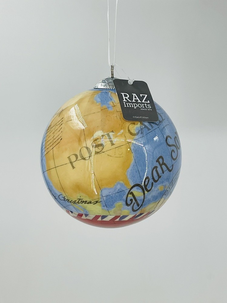 Get into the festive spirit with this charming RAZ Imports Dear Santa Map Ball Ornament. Measuring at a medium size of 5 inches, this multicolored plastic ornament is perfect for adding a touch of whimsy to your Christmas tree. The unique postcard design and artist-inspired features make it a standout piece among your holiday decorations. This ornament set includes a single bauble that is perfect for hanging. It is an ideal gift for your loved ones and a great addition to your collection. Bring a touch of Christmas magic to your home with this adorable ornament.