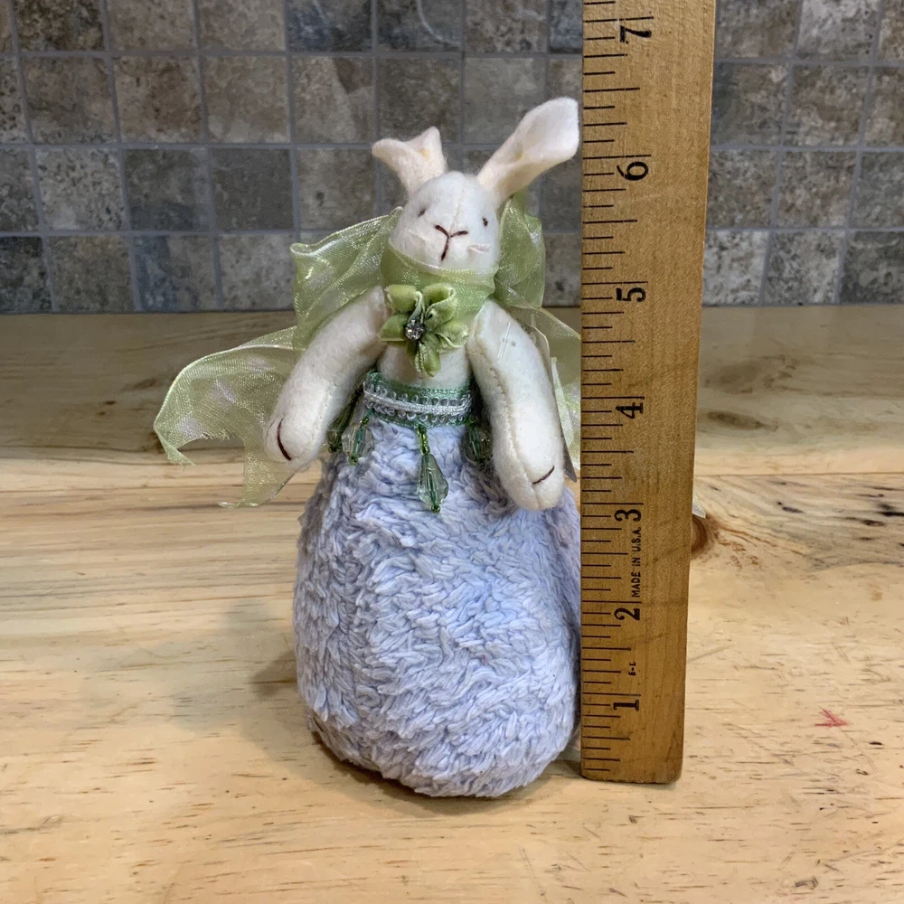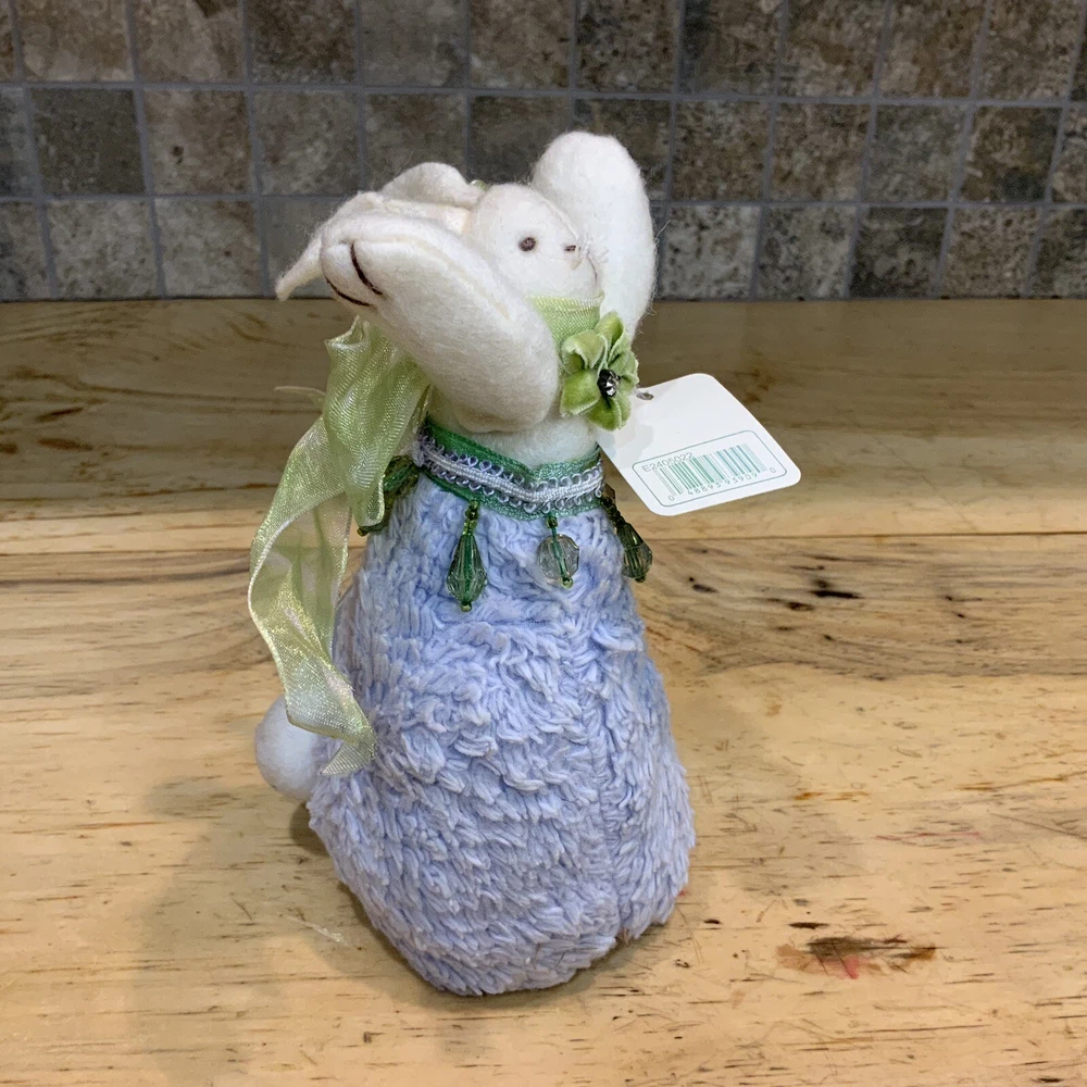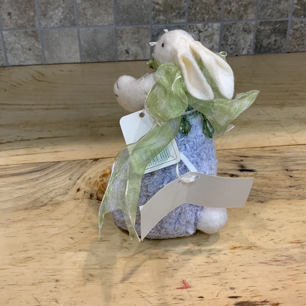 Add charm and elegance to your springtime decor with this RAZ Imports Easter bunny by designers Carol King & Paula Buttel. This plush figurine features a soft lavender base, delicate beaded embellishments, and a whimsical handcrafted style. Details: • Brand: RAZ Imports • Designers: Carol King & Paula Buttel • Material: Mixed media – plush body with beaded accents & rhinestone • Color: Lavender body, white bunny, green ribbon collar • Size: Approx. 6.5” tall • Style: Cottagecore, vintage-inspired Easter/spring decor • Original hang tag attached • Ideal for Easter centerpieces, shelf decor, or seasonal gifting Condition: Excellent condition with original tag. Clean and free of damage.