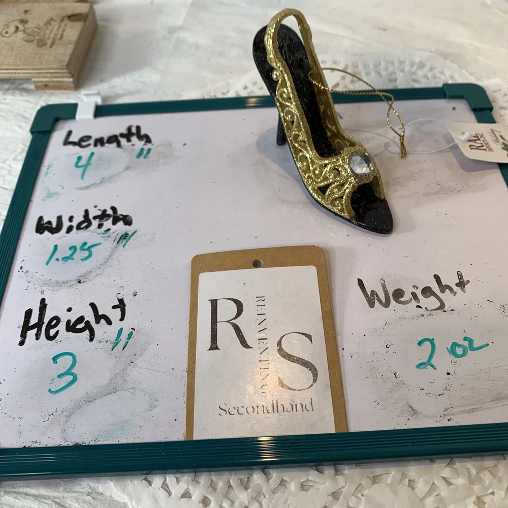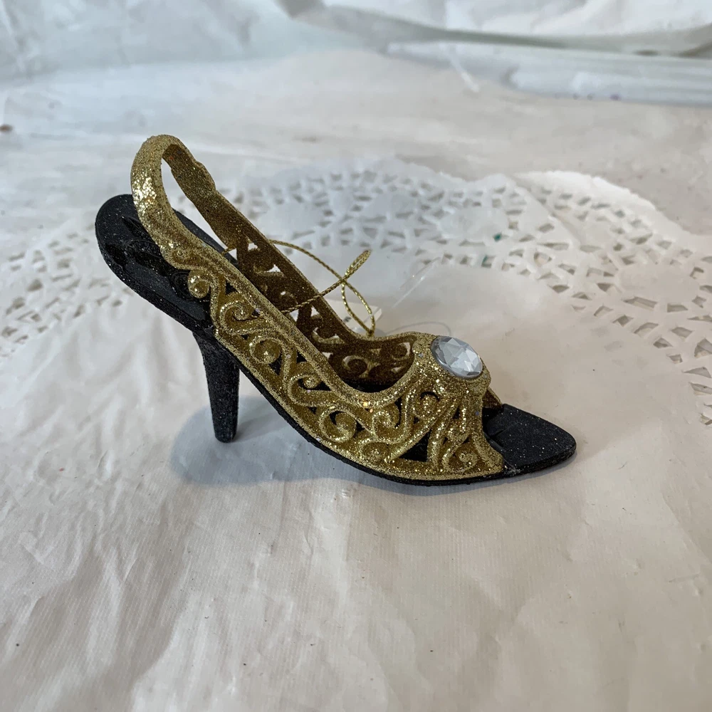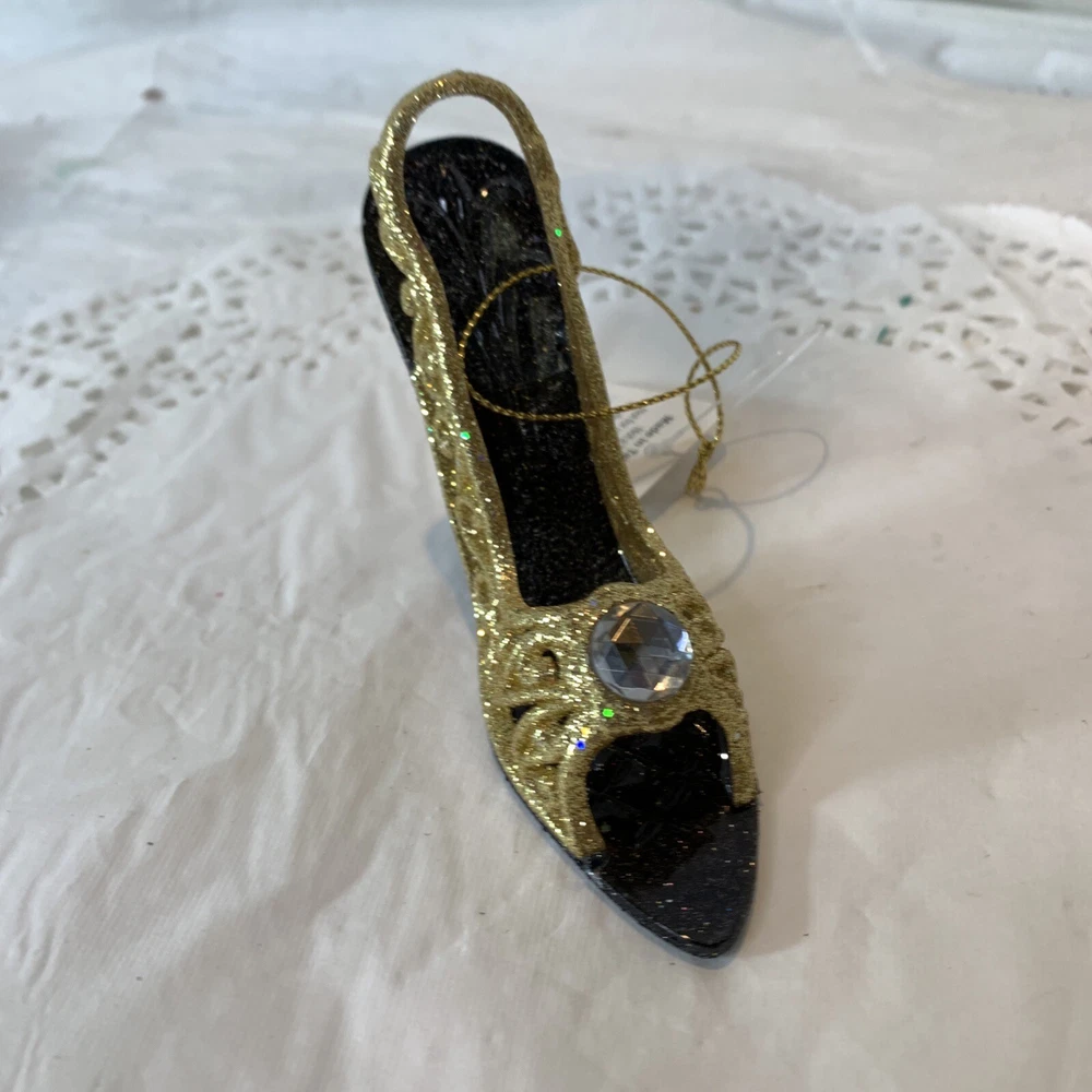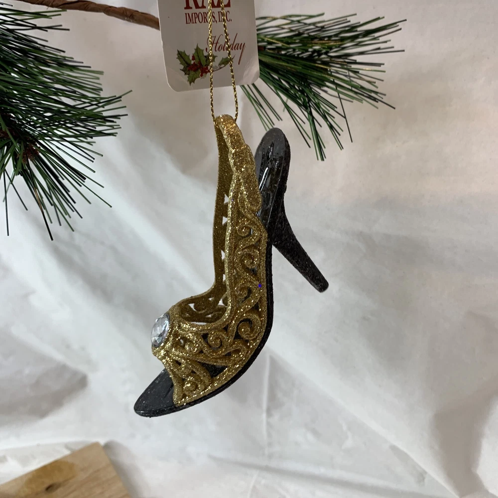Reinventing Secondhand - timeless treasures, vintage service. New Gold Glitter Filigree High Heal Shoe Christmas Ornament By Raz Imports Gold glitter and black high-heel-shaped ornament with a gem in the center! Features: Decorative High heel shaped Gold glitter Beaded accenting Hanging Reusable New with tags Great for decorating during the holiday season - d iscounts for buying more than one! Year: 2010 to now MPN: 3314107 Measurements: 3" H x 1.25" W x 4" L This is a new item with its original tags, never used. Ships from a smoke-free facility. Note: photos are part of the description. Be sure to check out the other Christmas ornaments in our store! Shipping Policy : We offer free shipping for some items within the continental USA. W e use the most economical service available at the time of shipment (it may not always be the one shown on the listing) . For paid shipping, we offer several options for your convenience. Please contact us beforehand if you prefer a carrier that is not listed or would like expedited or combined shipping for multiple items. We will do our best to accommodate you! Items are shipped within one day after receiving payment (not including weekends) . We carefully prepare items for shipment by wrapping materials/packaging to protect them from damage. Payment Policy: We accept forms of payment per eBay. Auction and Buy It Now payments are due within 24 hours of the sale. Payment must be received within 24 hours to ensure the transaction is not canceled. Cancellation Policy We generally allow up to three hours after purchase to cancel an order. After three hours, it is at our discretion to approve a cancellation. Return Policy : Many of our items are vintage and are sold "as is." We describe and photograph the items to show any wear or defects to the best of our ability. Perception of a"flaw" can vary from person to person. The photos are part of the description ; always refer to them and your eye as the default description; photos may show wear not captured in the description . Returns are ultimately accepted at our discretion, so please read the description, and review the images carefully before purchasing. Items ship from a smoke-free facility; however, some items were sourced from auctions, estate sales, etc. In rare instances, they may retain odor from their original homes (even after cleaning). * If you have questions about this or any item in our store, please message us anytime! * We look forward to "reinventing" with you and providing vintage service! Reinventing Secondhand.