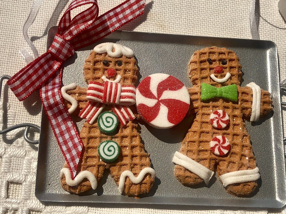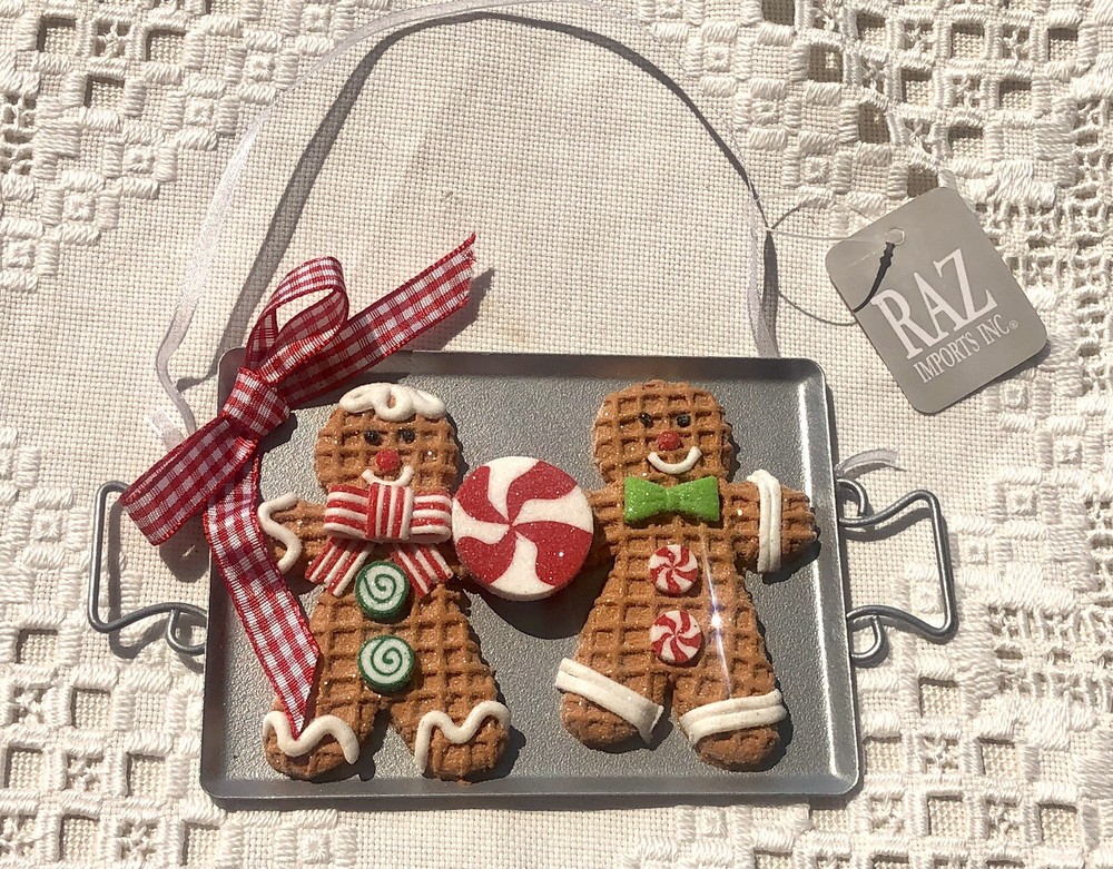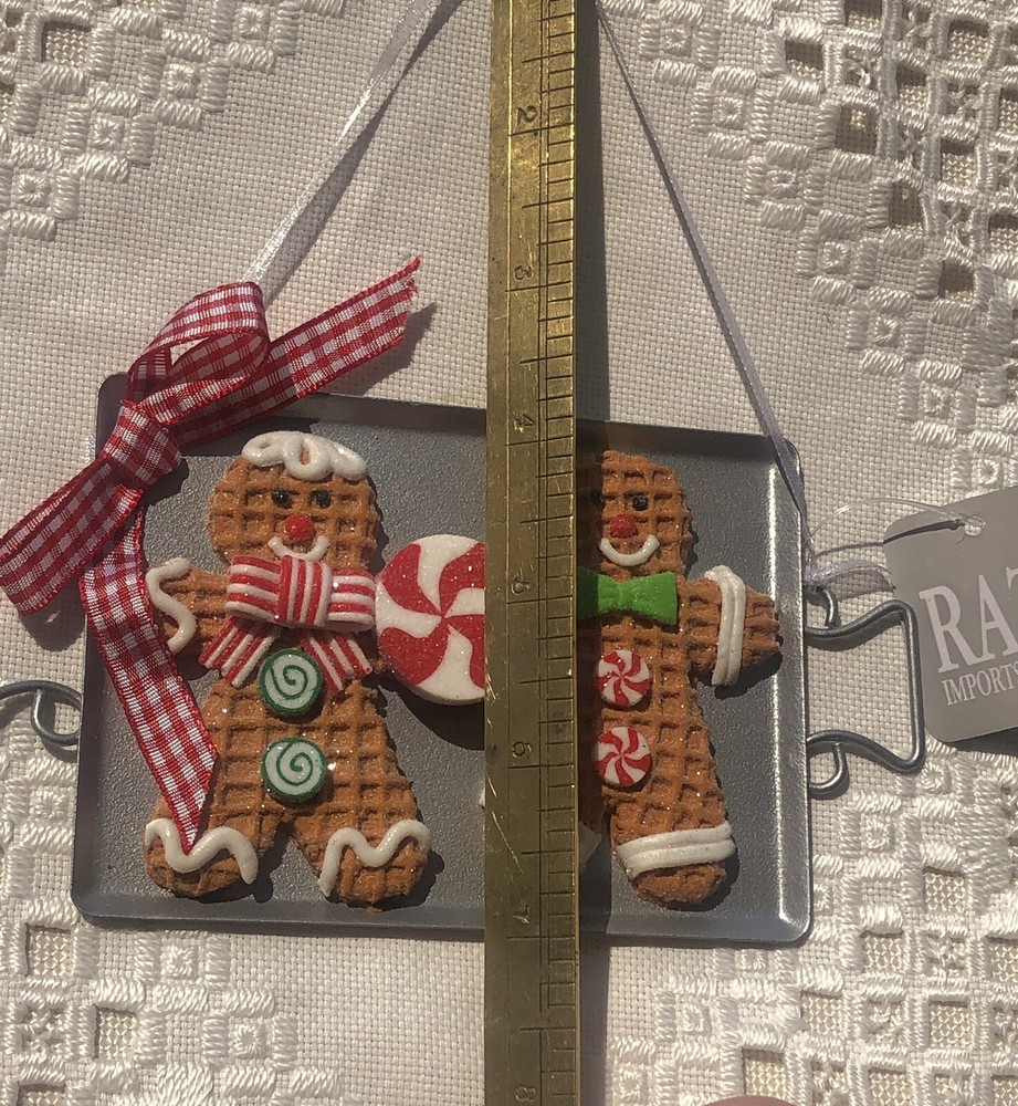 Add a touch of festive charm to your Christmas tree with this adorable Gingerbread couple on Cookie Tray Ornament. Features a cute gingerbread couple and is made of a variety of materials including mixed materials, glitter, clay dough, organza, ribbon, and metal This medium-sized ornament is perfect for any Christmas occasion and is sure to delight collectors of all ages. With its metallic sparkly finish and decorative features, it is a great addition to any ornament collection. Hang it on your tree or display it year-round to add a touch of whimsy to your home. Hangs 7” overall from attached white organza ribbon New with tag I ship USPS within one business day of receiving payment(usually same day!) SBXBIN