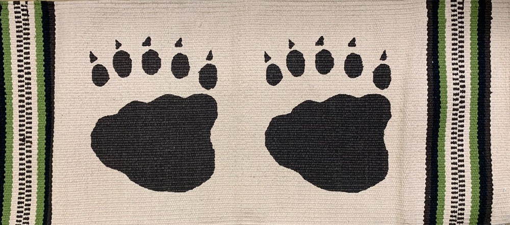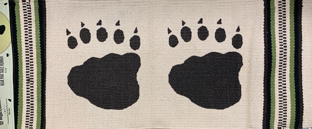 REGAL COMFORT BEAR PAW TABLE RUNNER. 1 00 P ercent cotton B eige with Green and Brown stripe B rown Paws 1 5” x 36” m achine Wash Tumble Dry Condition is New with tags. Shipped with USPS Priority Mail.