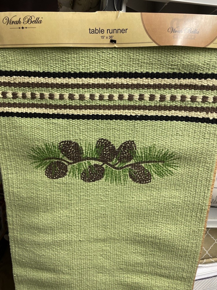 REGAL COMFORT “Green Pinecones” TABLE RUNNER. 1 00 % cotton Green Pinecones 1 5” x 36” m achine Wash Tumble Dry Condition is New with tags. Shipped with USPS Priority Mail.