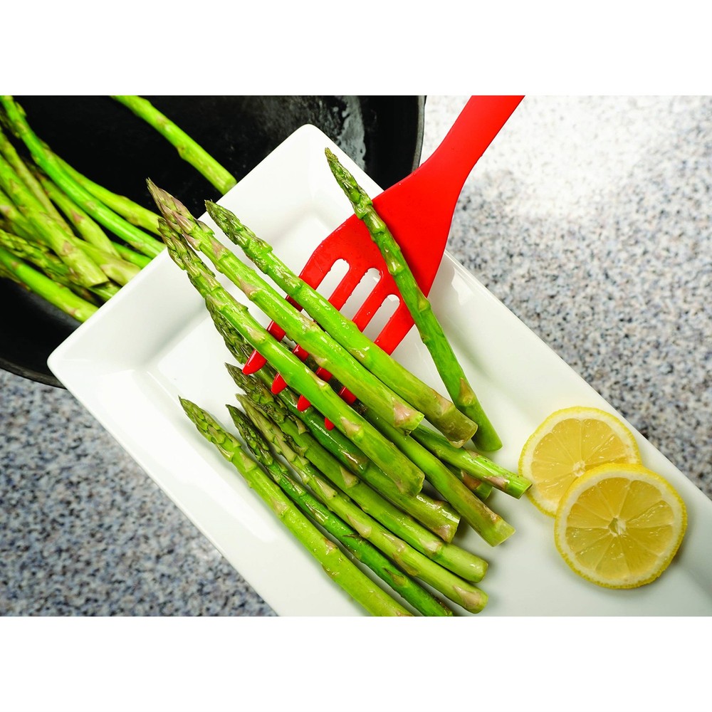 RSVP Silicone Fork - Red Perfect for mixing ingredients, mashing food, or scrambling eggs right in your nonstick pan Up to 425 degrees Fahrenheit or 220 degrees Celsius Measures 11-inches in length Made from durable Stainless Steel with stabilizing metal core Dishwasher safe Model No. : EFF-RD UPC : 053796406358 Brand : Design Imports RSVP Silicone Fork - Red