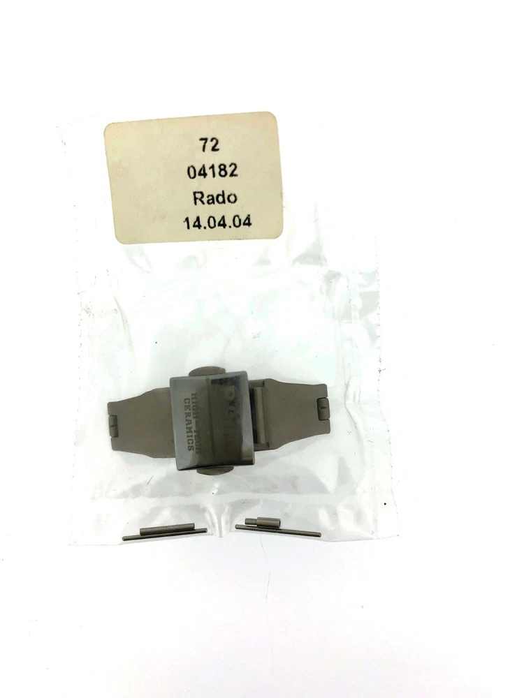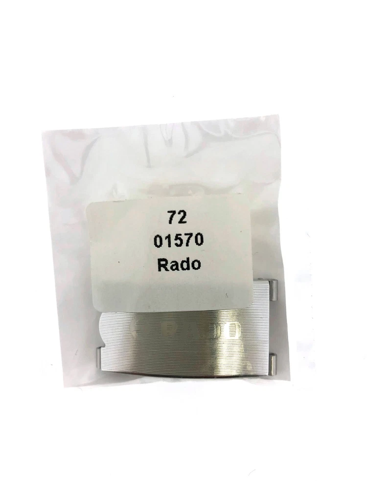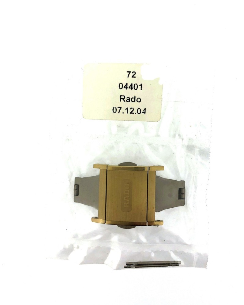 Rado Clasp - Original Push Button Butterfly Clasp, Fold-over Clasp to Fits : Available sizes: See Drop-Down Selection: RADOCL-04401 Rado Gold-tone Titanium Clasp (Sealed-New) Mens 17.3mm Opening Push Button Butterfly Fits Case Numbers: 160.0281.3, R20281152 Includes Pins RADOCL-04400 Rado Gold-tone Titanium Clasp (Sealed-New) Ladies 12mm Opening Push Button Butterfly Includes Pins RADOCL-04488 Rado Black Ceramic Titanium Clasp (Open Package) Mens 22mm Opening Push Button Butterfly RADOCL-04182 Rado High Tech Ceramic Titanium Clasp (Sealed-New) Ladies 12mm Opening Push Button Butterfly Includes Pins RADOCL-01770 Rado Gold Tone Clasp (Sealed-New) Mens 10.4mm Opening Fold-Over Clasp Includes Pins RADOCL-01570 Rado Silver Tone Clasp (Sealed-New) Mens 10.4mm Opening Fold-Over Clasp Includes Pins See image to locate Rado clasp model number.