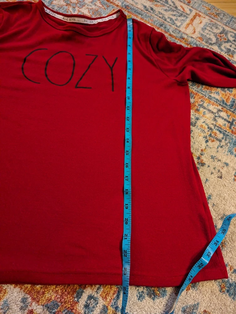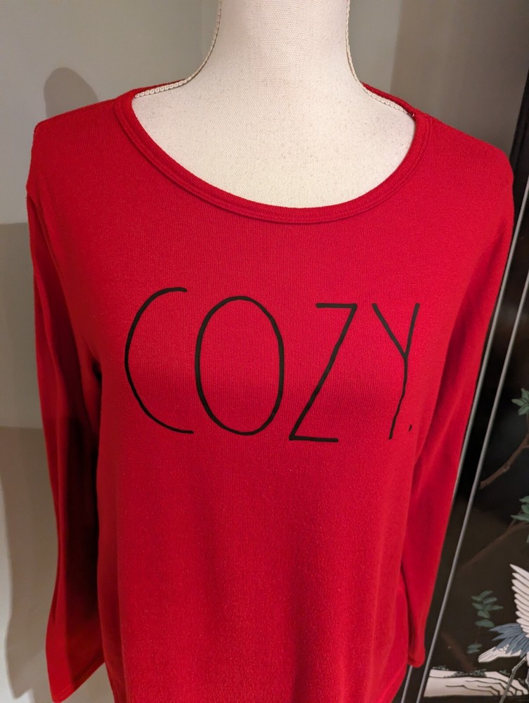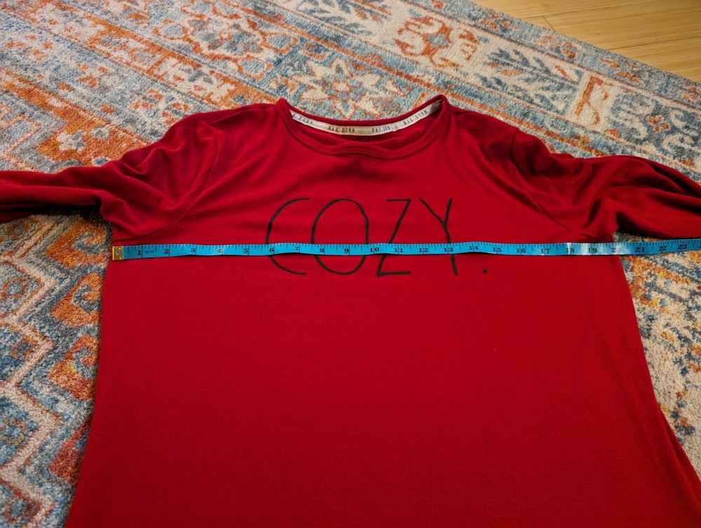 This super soft Rae Dunn pullover is incredibly cozy and perfect for lounging! The long sleeves and relaxed fit make it ideal for chilly nights. The red color is vibrant, and it’s in great pre-owned condition—just as described. Love the cute "Cozy" detail! Measurements were spot-on, making it easy to confirm the fit. Such a comfy and stylish find!