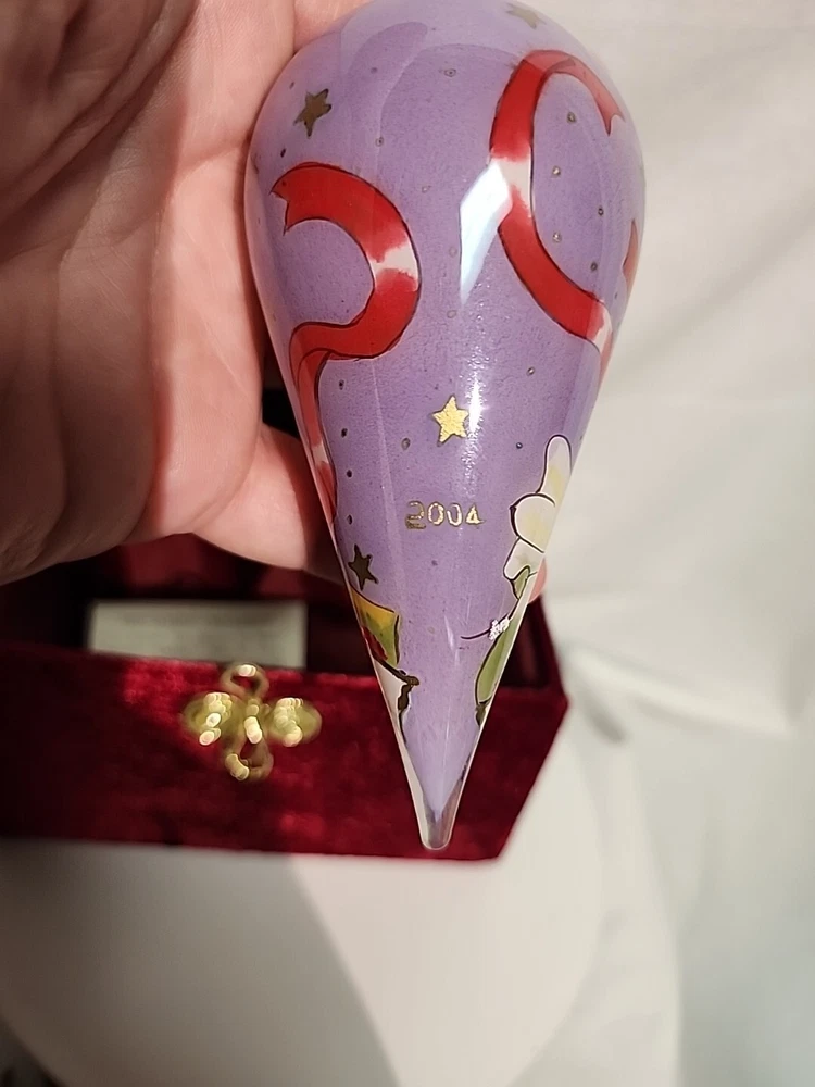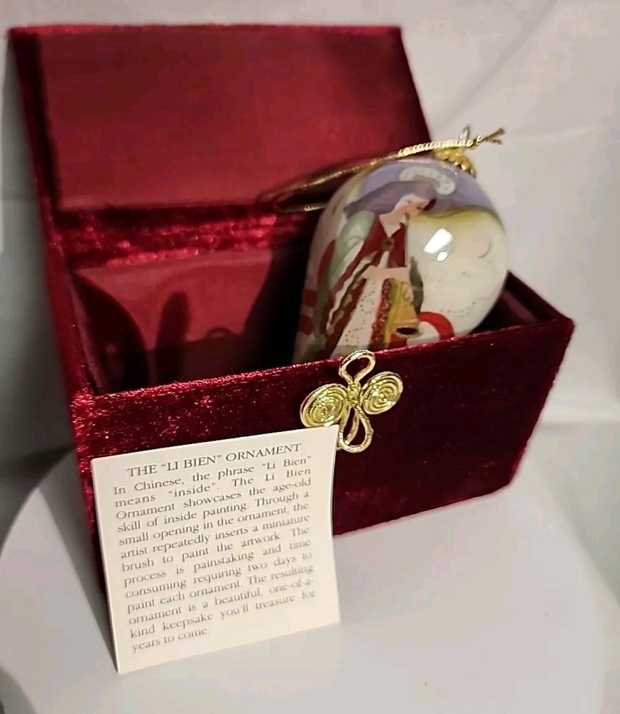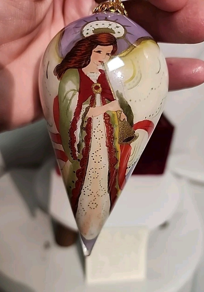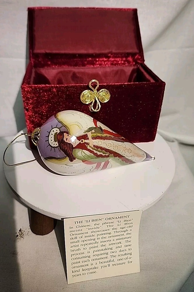 Add a touch of elegance to your Christmas decorations with this rare Pier 1 Imports Li Bien handpainted angel ornament from 2004. The teardrop-shaped ornament features a stunning angel design, handcrafted from medium-sized glass using the hand blown glass production technique. The ornament is decorative and features an artist-designed pattern, making it a unique addition to your collection. This original Li Bien ornament is perfect for anyone, regardless of age or gender. It comes with a set that includes one ornament and is an excellent gift idea for anyone who loves angels or art glass. The ornament is part of the Pier 1 Imports collection and is an original, licensed reproduction. Celebrate your holiday season in style with this exquisite ornament.