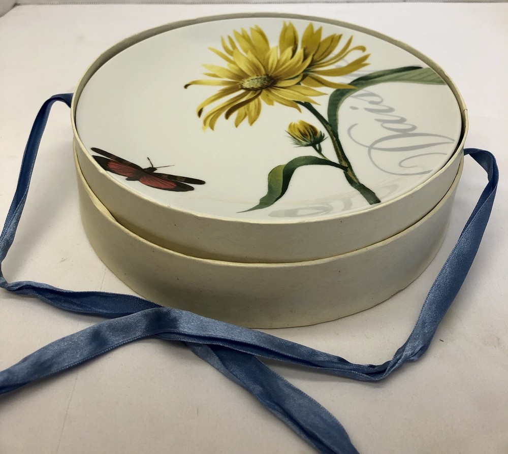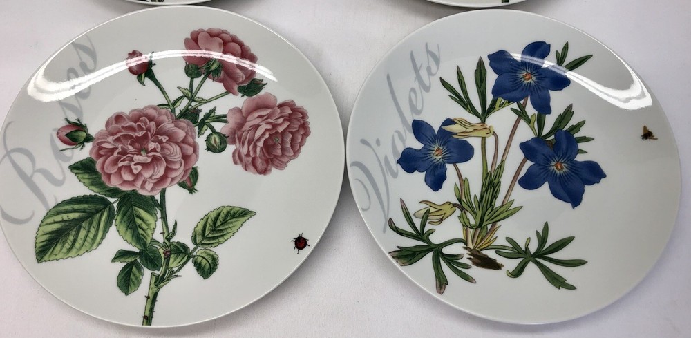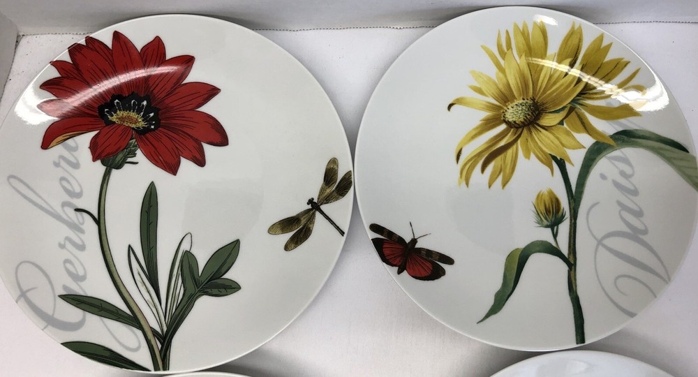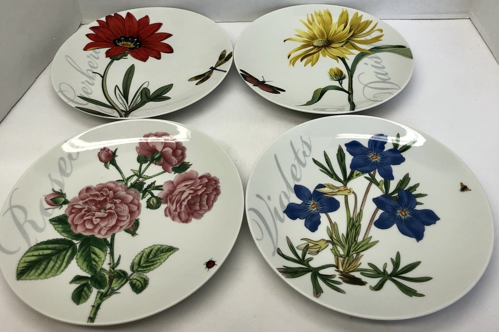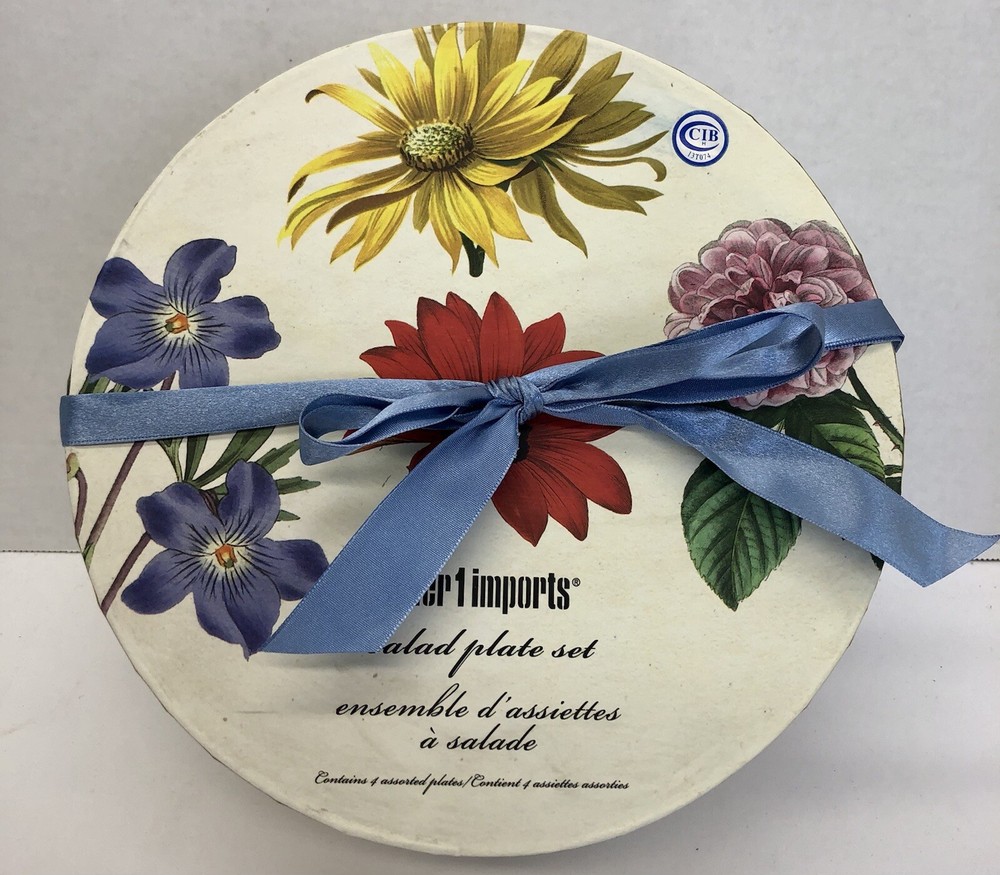 Introducing a rare and beautiful set of four salad plates from Pier 1, still in their original packaging. These plates feature a stunning floral pattern in a vibrant array of colors, perfect for adding a touch of nature to your kitchen or dining room. Made from high-quality porcelain and crafted with care in China, these plates are sure to impress both guests and family alike. Whether you're using them for special occasions or everyday meals, they'll make a lovely addition to any collection. Don't miss your chance to own these elegant and unique pieces. Great Condition plates are new box shows minimal wear See pics for condition and details