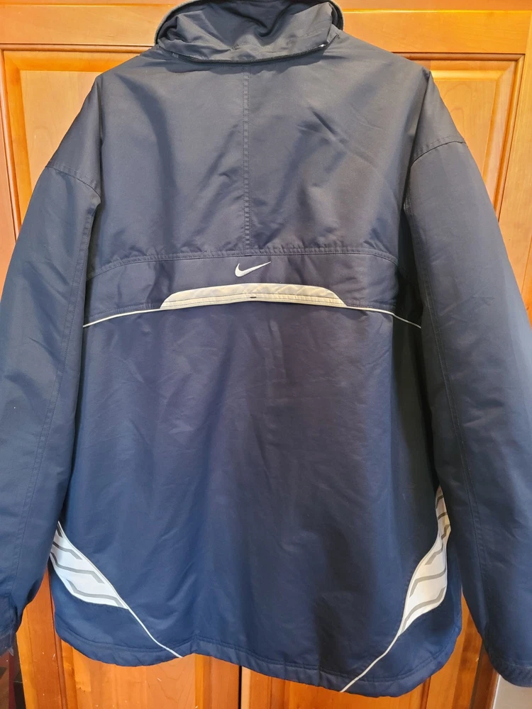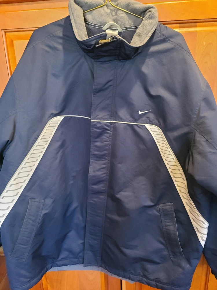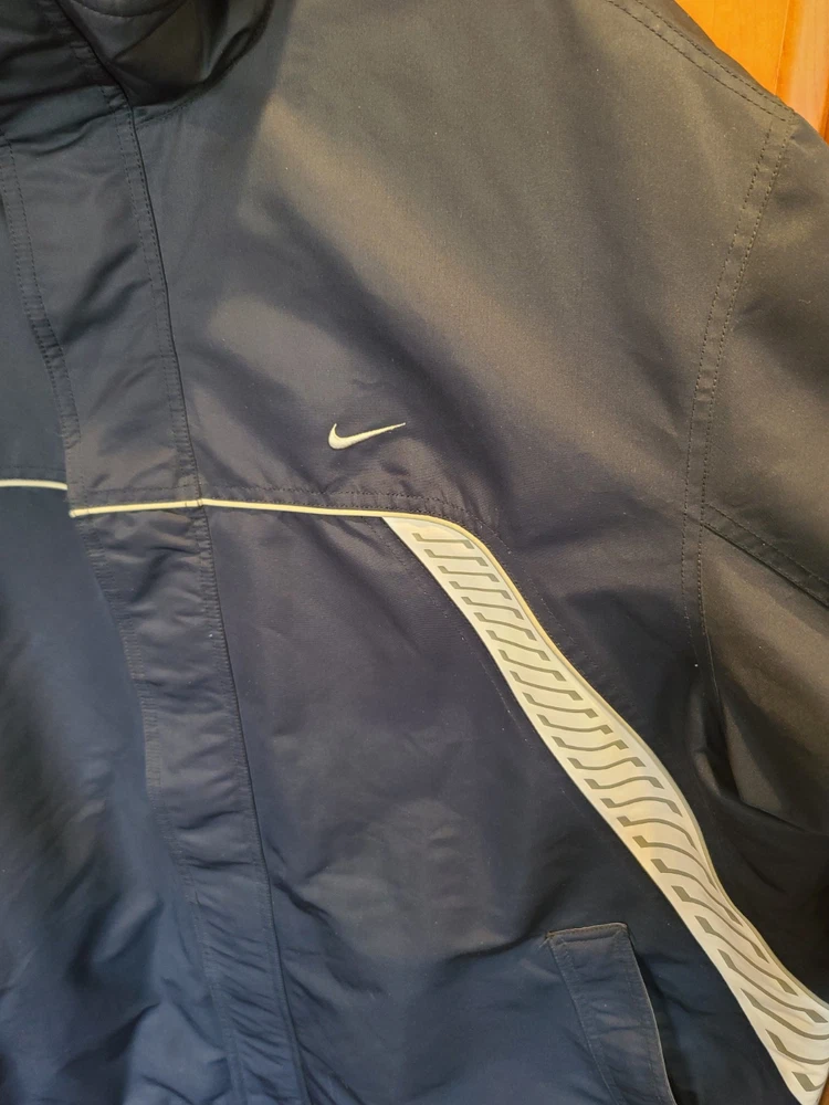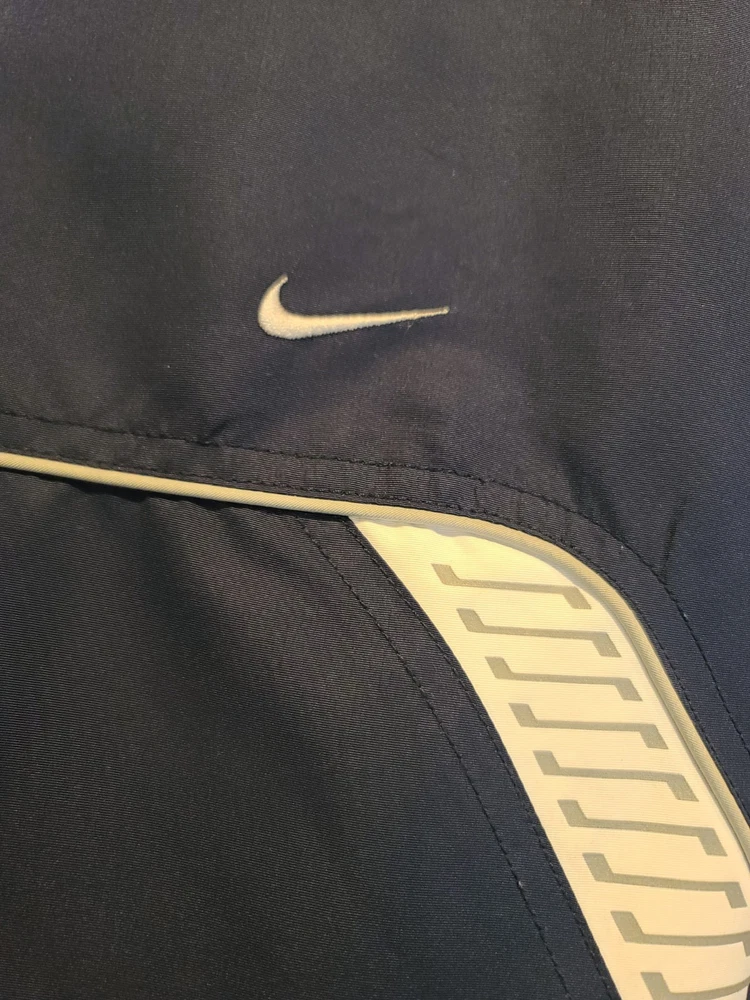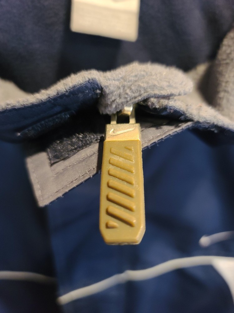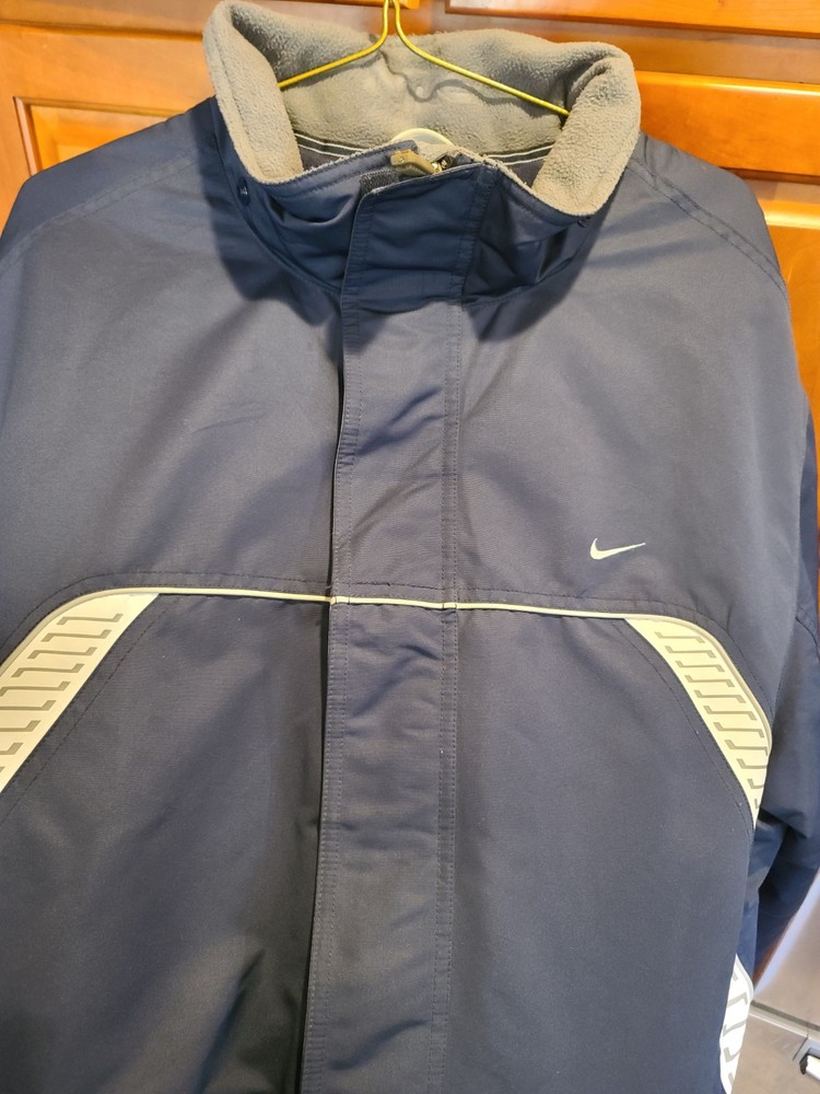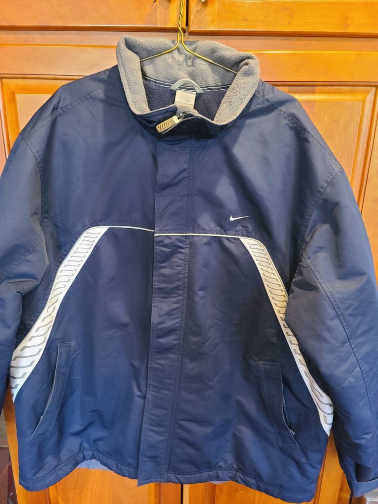 This vintage 90's Nike Silver Tag Puffer Jacket in size 2XL features a unique geometric design with embroidered accents, reflecting a retro sports theme. The jacket is crafted from nylon with a polyester lining, offering wind and water resistance suitable for winter and fall seasons. It has a relaxed fit with oversized zipped pockets, making it ideal for travel, parties, casual wear, formal occasions, and workwear. The jacket is characterized by its Zip-Up brand, adding a touch of nostalgia to its all-season functionality. Size 2XL / XXL Condition is Great Vintage Pre-owned. Does not include snap on hood. One very small spot along back silver line under embroidered nike logo. Strictly superficial. Pit to pit = 30" Length = 33" Please see all photos provided, as what is shown is exactly what you will receive