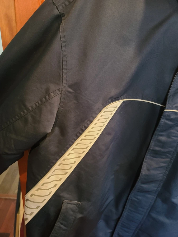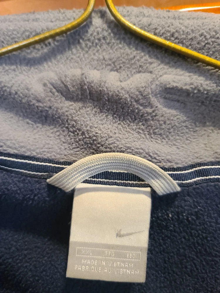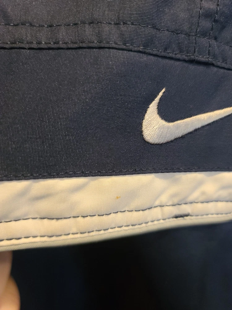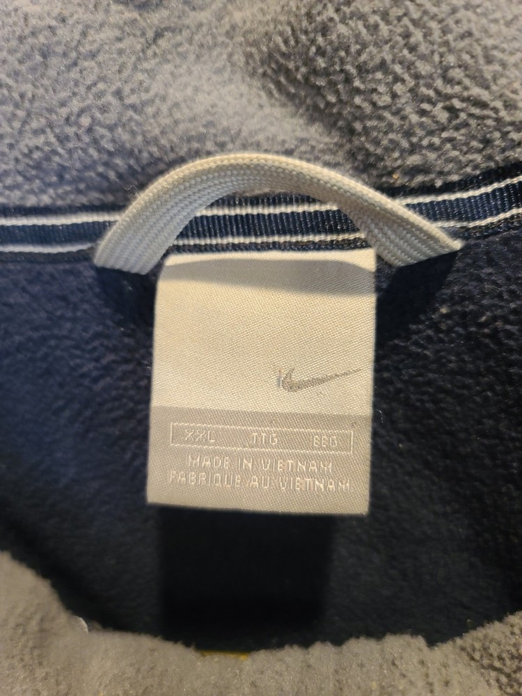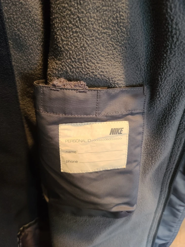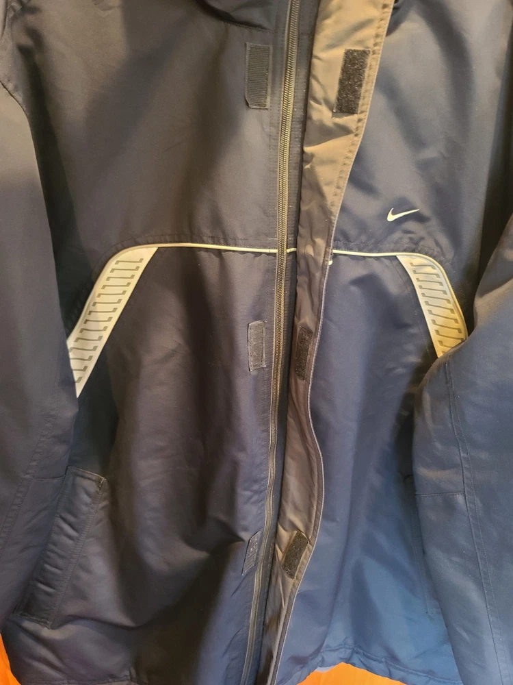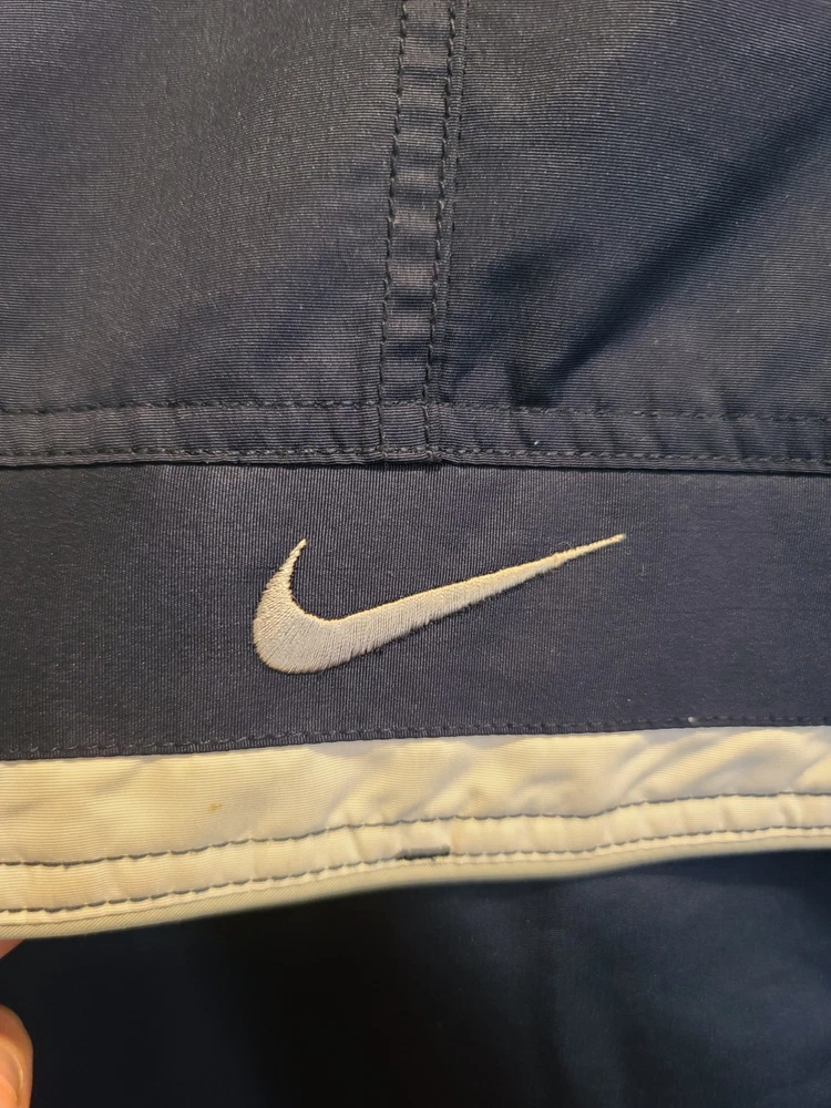 This vintage 90's Nike Silver Tag Puffer Jacket in size 2XL features a unique geometric design with embroidered accents, reflecting a retro sports theme. The jacket is crafted from nylon with a polyester lining, offering wind and water resistance suitable for winter and fall seasons. It has a relaxed fit with oversized zipped pockets, making it ideal for travel, parties, casual wear, formal occasions, and workwear. The jacket is characterized by its Zip-Up brand, adding a touch of nostalgia to its all-season functionality. Size 2XL / XXL Condition is Great Vintage Pre-owned. Does not include snap on hood. One very small spot along back silver line under embroidered nike logo. Strictly superficial. Pit to pit = 30" Length = 33" Please see all photos provided, as what is shown is exactly what you will receive