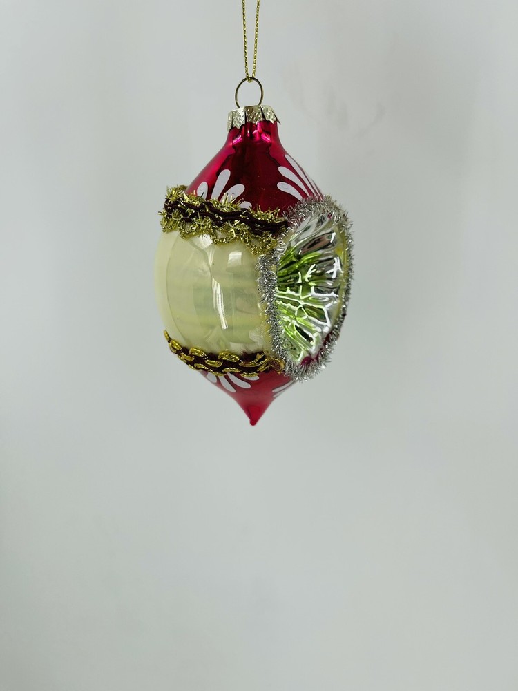 Add some vintage charm to your Christmas decorations with this stunning Raz Imports 5" glass reflector ornament. The irregular shape and multicolor tinsel design make it a unique addition to any holiday collection. Perfect for a medium-sized tree, this ornament is sure to catch the eye of your guests. Crafted by hand using traditional techniques, this ornament features intricate embellishments and is artist-designed. Whether you're a collector or just looking for a special ornament to mark the occasion, this one-of-a-kind piece is sure to bring joy and sparkle to your holiday season.