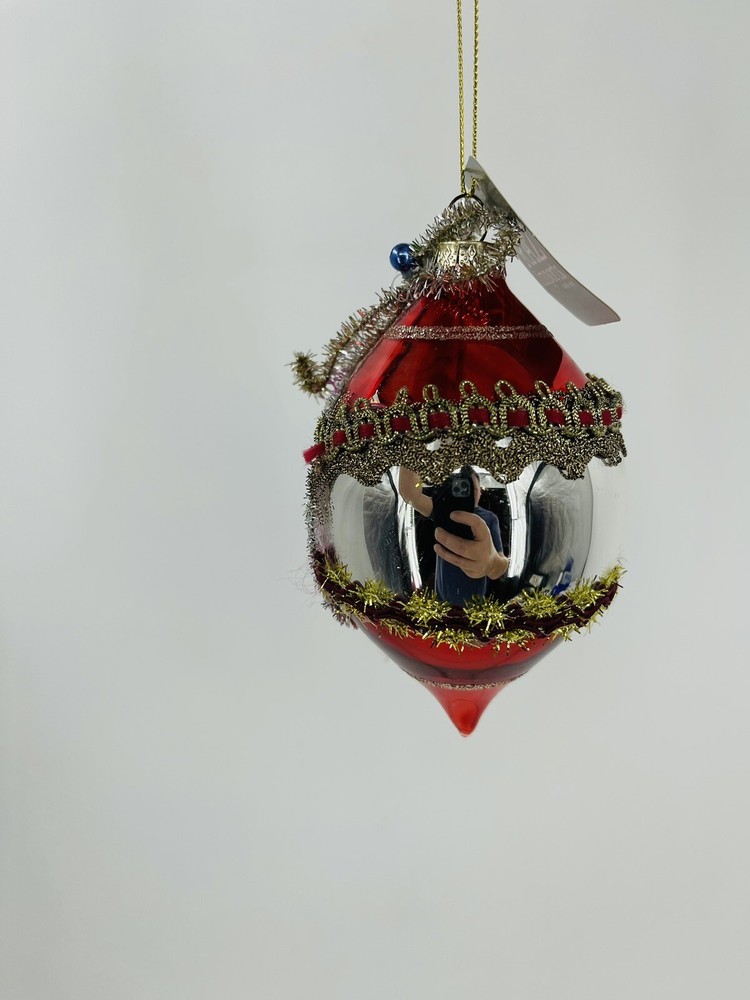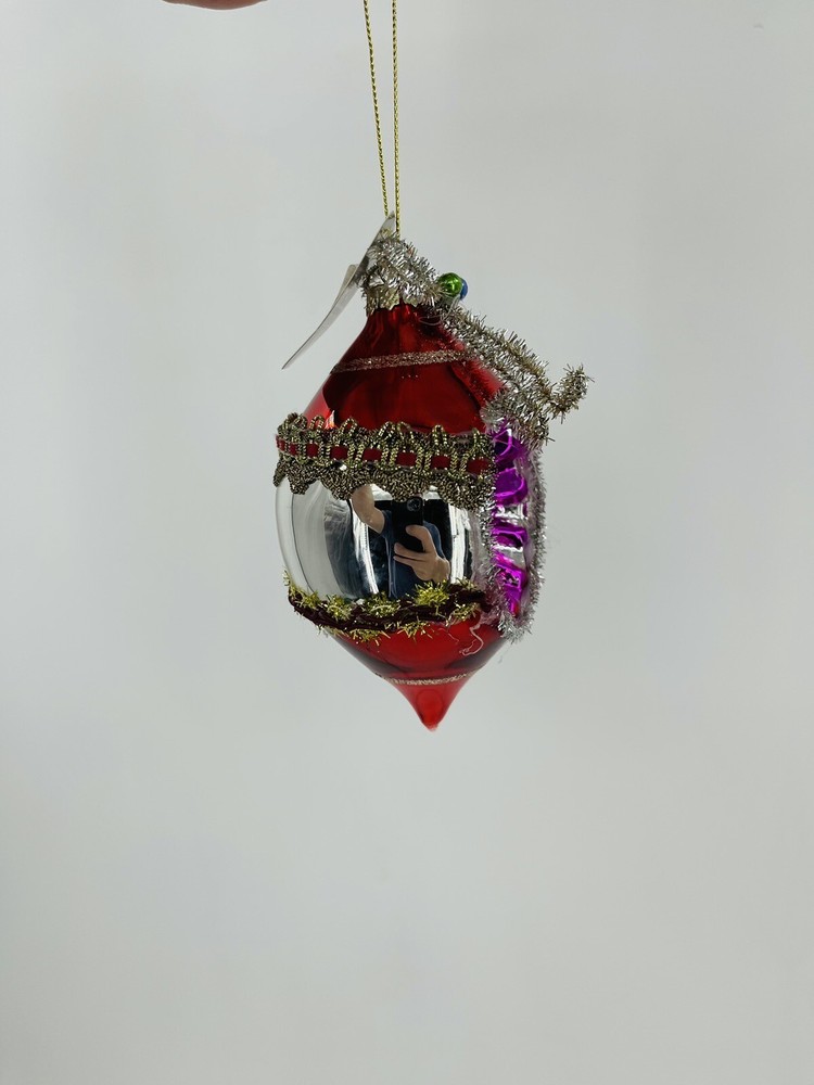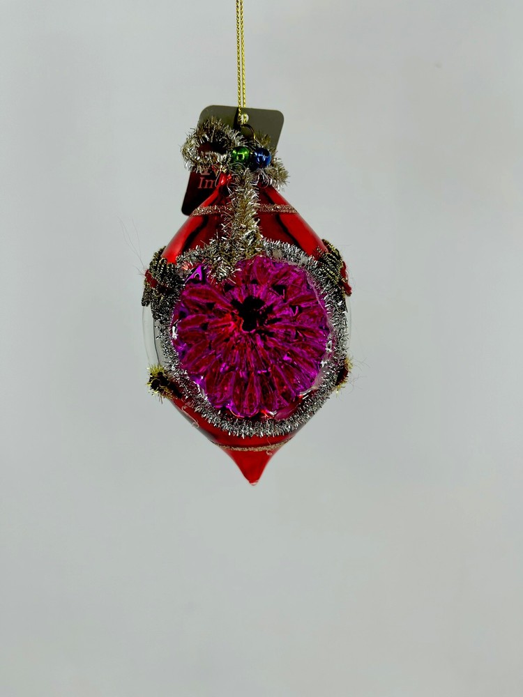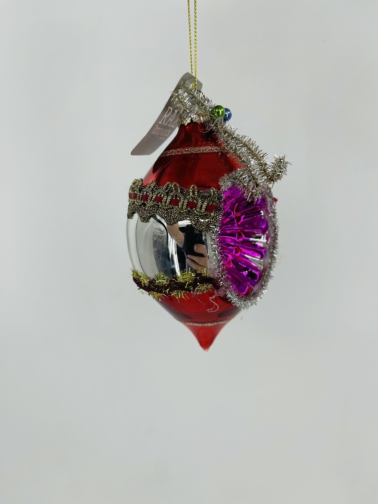 Add some vintage charm to your Christmas tree with this beautiful 5" ornament from Raz Imports. The handmade, hand-blown glass reflects light brilliantly, making it a perfect addition to your holiday decor. The ornament features an irregular shape and is embellished with tinsel, giving it a multicolor sparkle that is sure to catch your eye. Celebrate the holiday season with this artist-designed ornament that is part of the Raz Imports collection. This original, decorative item comes in a medium size and includes one ornament in its set. Don't miss out on this unique addition to your Christmas decor that is perfect for collectors and those who love handmade, artist-designed pieces.