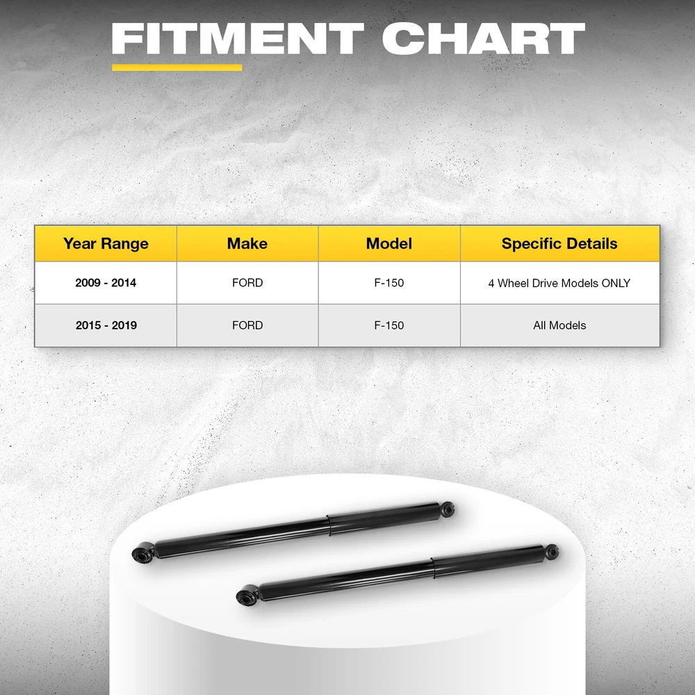 Kit Includes: 2x Complete Rear Shock Absorbers Assembly - Driver & Passenger Side - 4349108 FITS: MAKE MODEL YEAR RANGE SPECIFIC DETAILS FORD F-150 2009 - 2014 4 Wheel Drive Models ONLY FORD F-150 2015 - 2019 All Models About us Delivery details Return Policy Service Guaranteed Contact us About us We focus on creating the best product. Only high end advanced optical design are adopted. About Hykolity , Main product: LED Shop Light, Wall Pack Light, High Bay Light, Emergency Light, Fan Light, Vanity Light etc. Delivery details Usually 1-5 Business handling days. For remote areas, it could be a little longer. Return Policy Buyer pays postage if a wrong order, don't like it, or change mind. Seller pays postage if shipping damage or manufacturer defect. Returned item must be in the original package within 30 days upon receipt. Shipping and handling charges, insurance are not refundable. Service Guaranteed Your purchase is protected, with money back guaranteed. Any concern, we will try our best to help you. Contact us Our working time(excluding holidays): Monday to Friday, 9:00-18:00.
