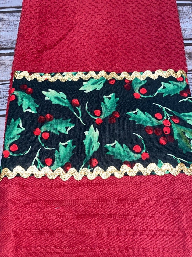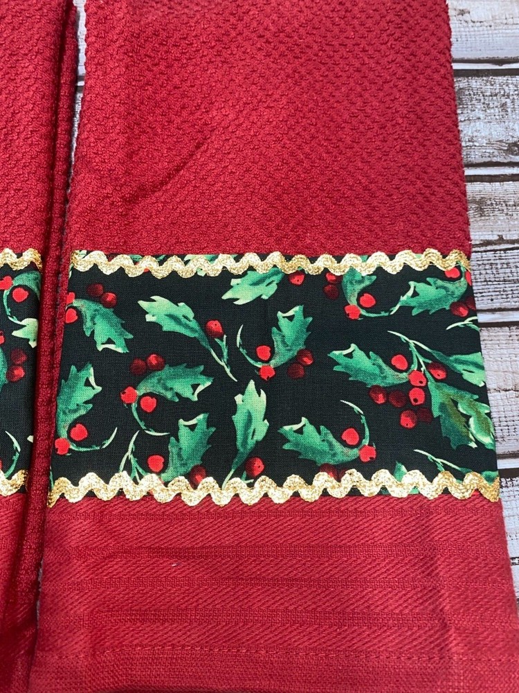 Christmas Theme Mistletoe w Holly Berries Theme Fabric and Gold Trim Decorated 100 % Cotton Red Kitchen Hand Towels 2 pc set BS2831 Decorative fabric and trim are width of hand towel Hand Towel 15"x 25"