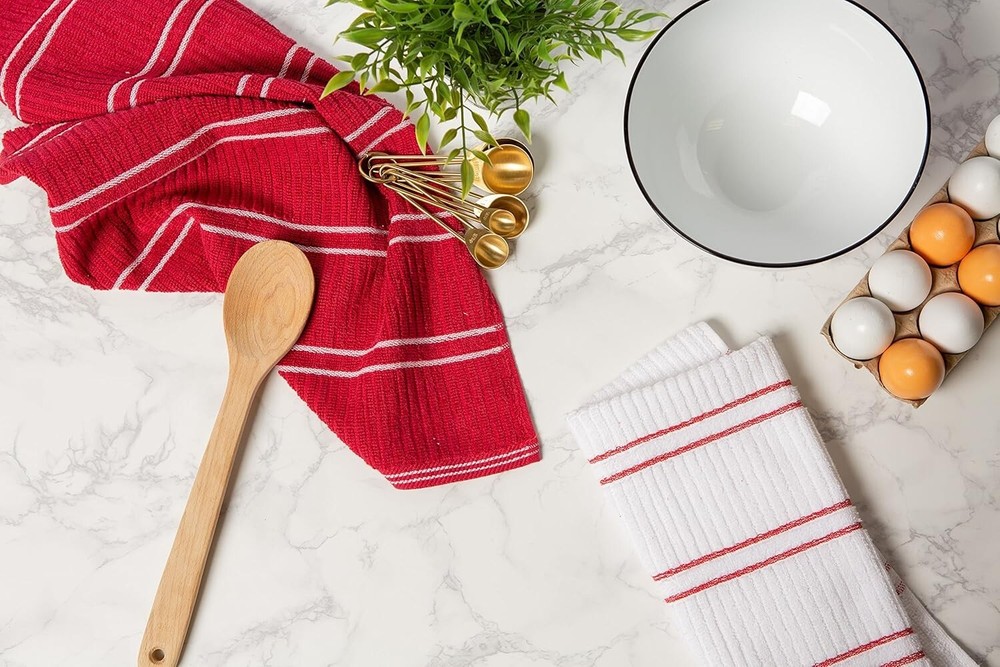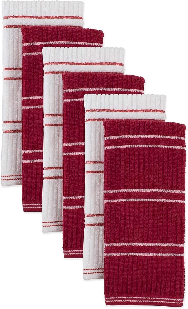 Ideal for everyday household use, this set of six soft and absorbent 100percent cotton terry woven towels are a favored, classic design. Each towel measures 16 inches by 26 inches. 6Pk set includes both positive and negative colorways providing an enriched look in your kitchen. Hard we a ring and absorbent, these towels will dry your dishes, mop up your spills and dry wet hands. A perfect addition to the kitchen. Machine wash in cold water with like colors and tumble dry low. Available in 3 other solid colors as well as matching dishcloths. Cotton PERFECT TO TACKLE ANY JOB: Set of 6 dish towels (3 of each color) measure 16x26", multi-purpose towels can tackle drying, wiping, and cleaning throughout your home and kitchen. EASY CARE LONG-LASTING MATERIAL : 100% Cotton Fabric, Machine Washable. Wash with cold water in gentle cycle & tumble dry low. Do not bleach them or run them through a hot dryer. GREAT GIFT : These towels are lightweight, absorbent, durable, and dry quickly for daily use to keep dishes, glasses, and countertops clean. MIX AND MATCH WITH YOUR DÉCOR : Bulk pack towels are not only for home & kitchen but also perfect for restaurants, hotels, bars, office kitchens or breakrooms, and more.