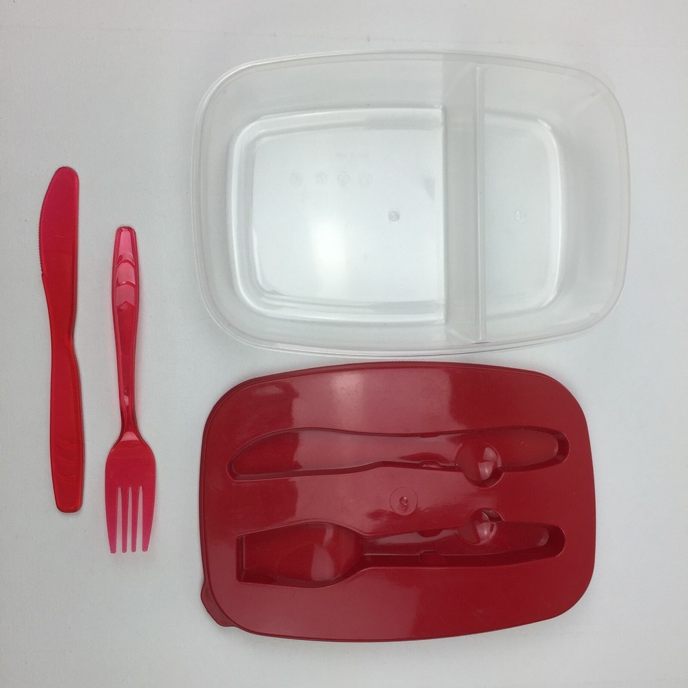 Red Divided Lunch Box Food Container Fork & Knife BPA Free 2" tall 6" wide